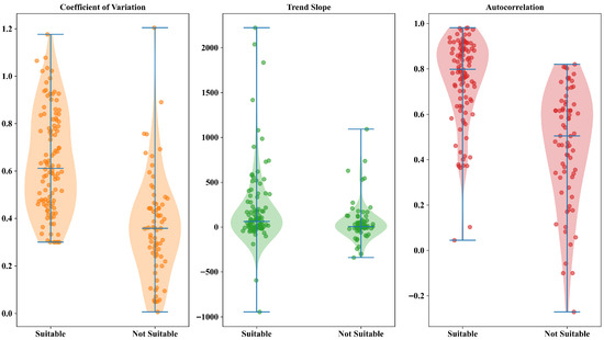 The gas fields unsuitable for fractal analysis exhibit dynamic features inconsistent with a fractal structure. Regarding volatility, their CV values are widely distributed, encompassing sequences with extremely gentle fluctuations as well as those with drastic production changes, thereby undermining the self-similarity basis under scale transformation. In terms of trend characteristics, the trend slopes mostly approach zero, lacking a sustained and clear evolutionary direction. Autocorrelation is generally weak, with 61.4% of fields having values below 0.6, indicating short-lived memory effects within the sequences. Collectively, these characteristics limit the applicability of fractal analysis for this group of fields (Figure 1).