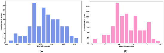 Among the shale gas fields suitable for fractal analysis, the mean Hurst exponent (H) is 0.78 (range: 0.64–0.92), and the mean fractal dimension (D) is 1.5 (range: 1.0–1.9) (Table 2). The calculation of H and D values is directly based on the original production sequence. These values collectively indicate that their production behavior exhibits strong persistence and moderate structural complexity. Regarding statistical characteristics, the standard deviation of H is 0.07, suggesting a relatively concentrated distribution of this parameter. This further reveals the significant long-term memory present in the production sequences of these shale gas fields and verifies the applicability of fractal theory for characterizing the inherent patterns in their production dynamics. The standard deviation of D is 0.25, with values primarily distributed in the 1.3–1.7 range, reflecting a moderate to high degree of structural complexity and dynamic irregularity in the production systems of these shale gas fields (Figure 2).