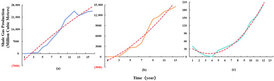Figure 3. Production Trend Curve of Stable-Growth Shale Gas Fields (The red dashed line denotes the production trend line). (a) Gas Field No.1; (b) Gas Field No.2; (c) Gas Field No.3.