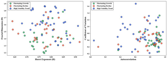 A high H value indicates strong persistence, where current trends tend to continue. This stable, directional dynamics produces smoother paths with less spatial occupation, corresponding to lower D values. Conversely, low H reflects anti-persistence or mean-reversion, marked by frequent fluctuations and reversals. Such oscillatory behavior creates complex, winding paths with higher space-filling capacity, thus yielding larger D values [31].