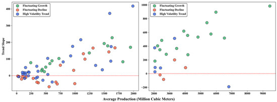 Trend Slope vs. Mean Production Rate Across Variability Types (Extreme Points Excluded; The red dashed line indicates the zero-mark line).