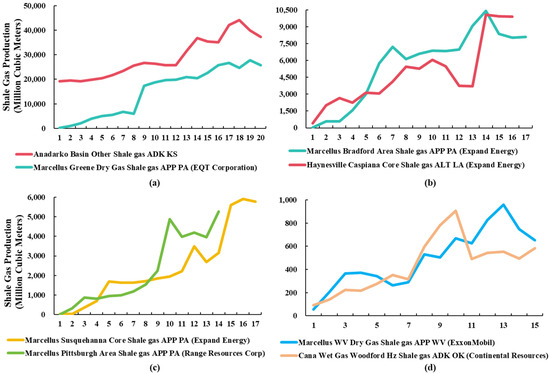Among shale gas fields with fluctuating growth characteristics, fields of different productivity levels exhibit distinct production dynamics. Ultra-high-productivity fields show an overall upward production trend. Some of these fields experienced steady growth initially, followed by significant acceleration later, while others exhibited slow initial growth, rapid mid-term increase, and then continued steady rise, maintaining high overall production levels (Figure 7a). High-productivity fields generally grew rapidly in the early stages. Some fields showed fluctuations after reaching a certain production level but maintained an overall upward trajectory; others rose rapidly in the later stages before slightly declining, yet remained within the high-production range (Figure 7b). Medium-productivity fields initially grew relatively slowly, then gradually increased their growth rate, showing significant growth particularly in the later stages, with sustained production increases (Figure 7c). Low-productivity fields exhibited a fluctuating rise overall, but the growth rate was relatively slow, and production levels consistently remained low. Data analysis indicates that both ultra-high- and high-productivity shale gas fields possess substantial remaining recoverable reserves, classifying them as large gas fields (Figure 7d). For instance, the Anadarko Basin Other Shale gas field (ADK KS) achieved a production of 37,641.9 million cubic meters in 2024, with remaining recoverable reserves of 617.56 billion cubic meters. The Marcellus Bradford Area Shale gas field (APP PA, Expand Energy) had a production of 8107.5 million cubic meters in the same year, with remaining recoverable reserves of 561.20 billion cubic meters. Medium-productivity shale gas fields are classified as medium-sized fields; for example, the Marcellus Susquehanna Core Shale gas field (APP PA, Expand Energy) had a production of 5786.0 million cubic meters in 2024, with remaining recoverable reserves of 63.81 billion cubic meters. In contrast, low-productivity shale gas fields are small fields, such as the Marcellus WV Dry Gas Shale gas field (APP WV, ExxonMobil), which had a production of 651.9 million cubic meters and remaining recoverable reserves of 6.99 billion cubic meters in 2024.