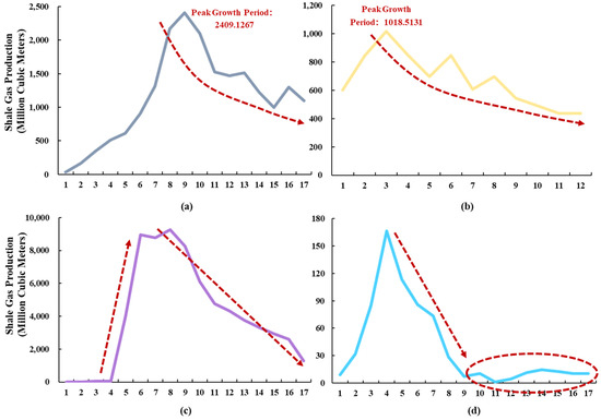 Typical Fluctuating-Growth Shale Gas Fields by Production Level (Time: year). (a) Ultra High-yield Shale Gas Field; (b) High-yield Shale Gas Field; (c) Middle Class Shale Gas Field; (d) Low-yield Shale Gas Field.