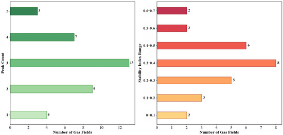 The production sequences exhibit generally high CV values, with most exceeding 0.6. This underscores substantial volatility and high dispersion of production across different time periods, thereby statistically corroborating the classification as a high-volatility trend type. In terms of morphological evolution, the production profiles of most fields display complex dynamic patterns, including multiple production peaks and phases of rapid increase or decrease. Specifically, the most common occurrence is 13 fields exhibiting three periodic production peaks. The stability index is predominantly low, with the highest concentration (8 fields) in the 0.3–0.4 range, and another 5 fields falling within 0–0.2. This overall distribution indicates a system marked by significant disorder and periodic variability (Figure 9).