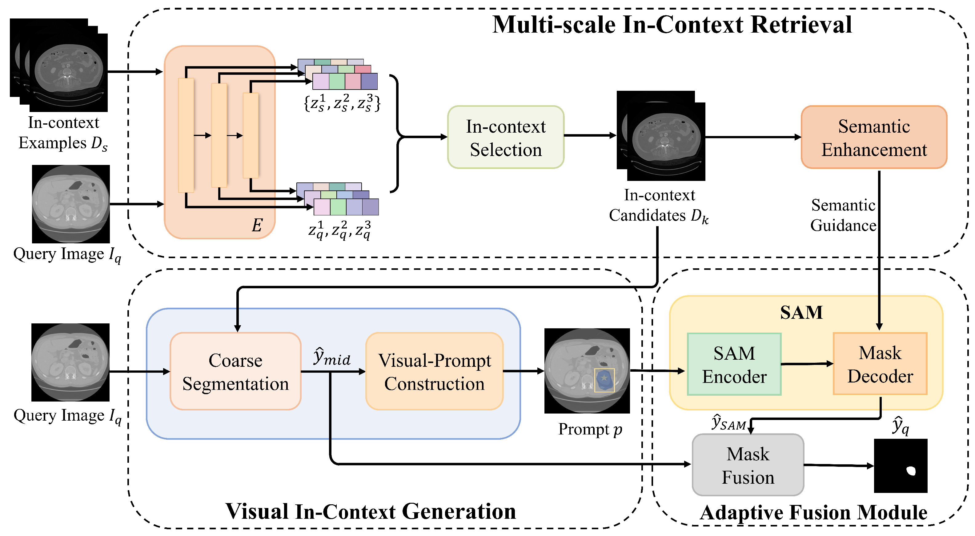 - We propose a visual in-context generation strategy that leverages a visual prompt construction module to generate multi-granularity visual prompts tailored for SAM. Furthermore, an adaptive fusion module seamlessly integrates semantic guidance signals and visual prompts to effectively guide SAM’s segmentation process, ensuring the generation of high-quality segmentation masks.