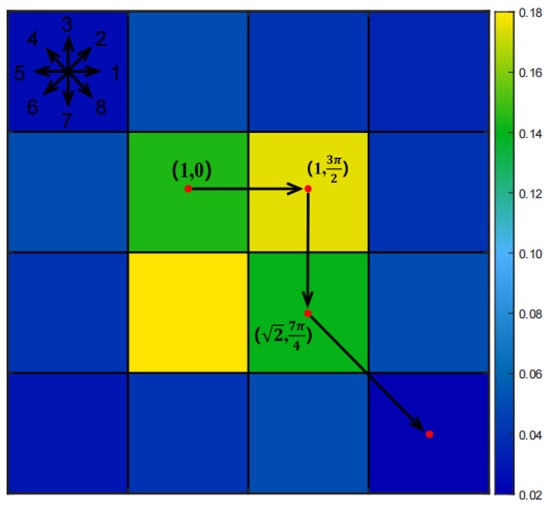 In the process of UAV moving target search, the probability of the target’s future position depends only on its current position; thus, the target motion pattern is modeled as a Markov process. This characteristic can not only adapt to the limitation that UAVs can only obtain real-time or recent information but also support the dynamic update of the belief map based on recursive Bayesian estimation, while reducing the problem complexity to meet real-time search requirements. Since all the targets in this study have specific conditions, the motion of the target depends only on its initial position . In this context, the probability of the target transitioning from grid to grid is denoted as . Since the probabilities of all cells are known, according to Bayes’ theorem, if the initial position of the target is known, the complete trajectory of movement of the target can be obtained.