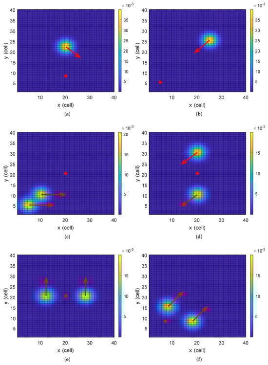 From Equation (2), it follows that when the target is at grid , its belief map is . This also represents the conditional probability of the target from time 1 to time , i.e., . Given the known target position , the predicted belief map at time t can be derived from Equation (2). Multiplying this by the computed conditional probability yields the belief map update formula, as shown below: