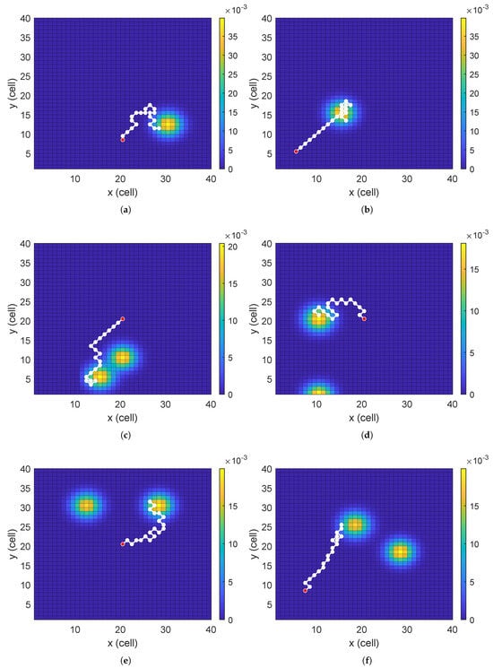 Best search paths for each scenario produced by FOBKA. (a–f) correspond to scenarios (1)–(6), respectively. Red dots are the initial positions of the UAV, and white dots are the nodes on the UAV’ optimal search paths.