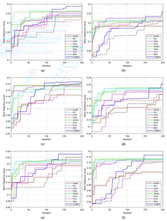 Among them, Type 1 is the BKA algorithm without any strategy, Type 2 is the BKA algorithm using only the motion-encoded mechanism, Type 3 is the BKA algorithm with the alternating update mechanism added on the basis of Type 2, and Type 4 is the algorithm that introduces the fractional-order strategy on the basis of Type 3, which is also the FOBKA algorithm proposed in this paper. It can be seen from the experimental conclusions in Table 6 that as the improved strategies are gradually added, the optimal value, average value, and worst value of the algorithm continue to increase, and the standard deviation continues to decrease. Moreover, Type 4, namely the FOBKA algorithm proposed in this paper, achieves the best comprehensive performance in the experimental results. All improved strategies have positive effects, and the effect is optimal when they are synergistically combined, which verifies the necessity and synergistic value of each improved strategy.