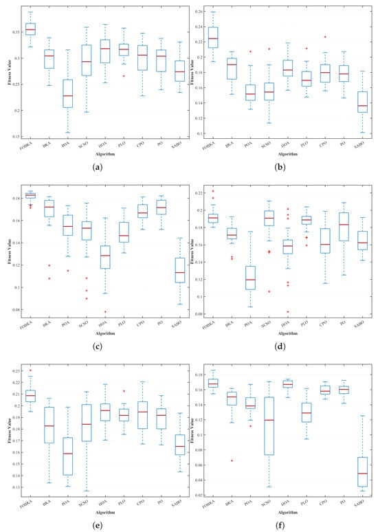 Figure 6 shows the box plots of the fitness values distributed in 30 independent runs of each of the 9 algorithms. By examining the position, length, and outliers (red plus signs) of the box plots, one can visually compare the central tendency and dispersion of the results from each algorithm, thereby assessing their stability. As shown in the figure, FOBKA consistently ranks among the top in terms of median fitness values in six scenarios (with the red line within the box being relatively high), exhibits concentrated results (short box length), and demonstrates superior stability and performance; SABO often exhibits low fitness values and high dispersion; POA shows significant dispersion in scenarios 1 and 4–5; SCSO exhibits significant dispersion and is prone to extreme values in scenarios 1–2 and 5–6, indicating poor stability.