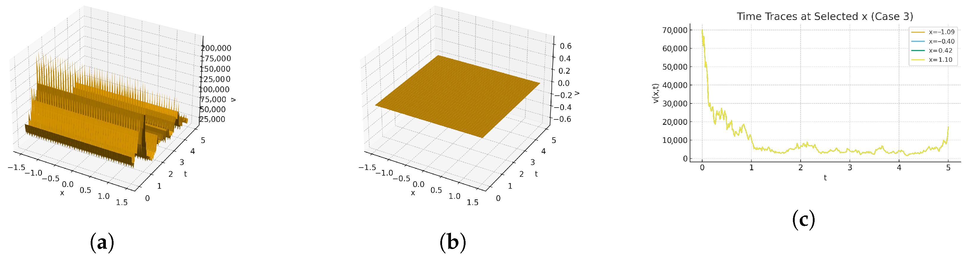 - Alhakim, L.; Gasmi, B.; Moussa, A.; Mati, Y. Bifurcation, Chaotic Behaviour and Soliton Solutions of the Kairat-II Equation via Two Analytical Methods. Partial Differ. Equ. Appl. Math. 2025, 13, 101135. [Google Scholar] [CrossRef]