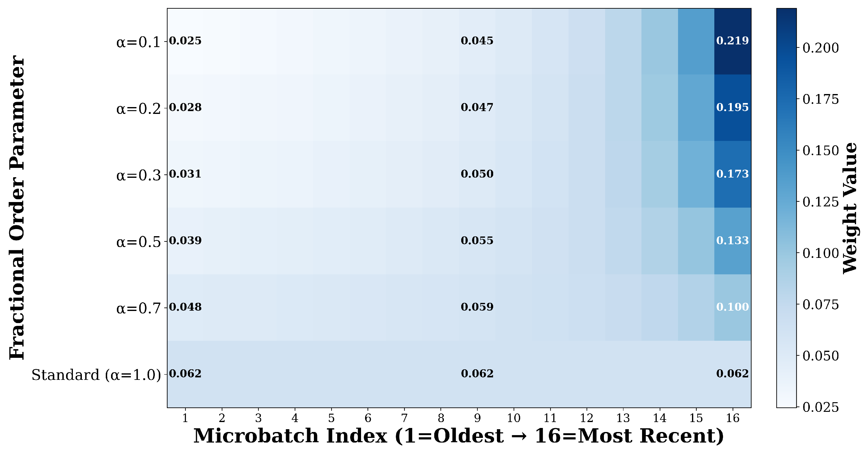 Property 2 (Smooth interpolation): The fractional order parameter provides continuous interpolation between uniform weighting ( yielding for all i) and increasingly aggressive recency bias as decreases toward zero. This smooth parameter space enables fine-grained control over the trade-off between temporal emphasis and historical retention, facilitating principled hyperparameter selection through standard tuning procedures rather than requiring discrete architectural choices.