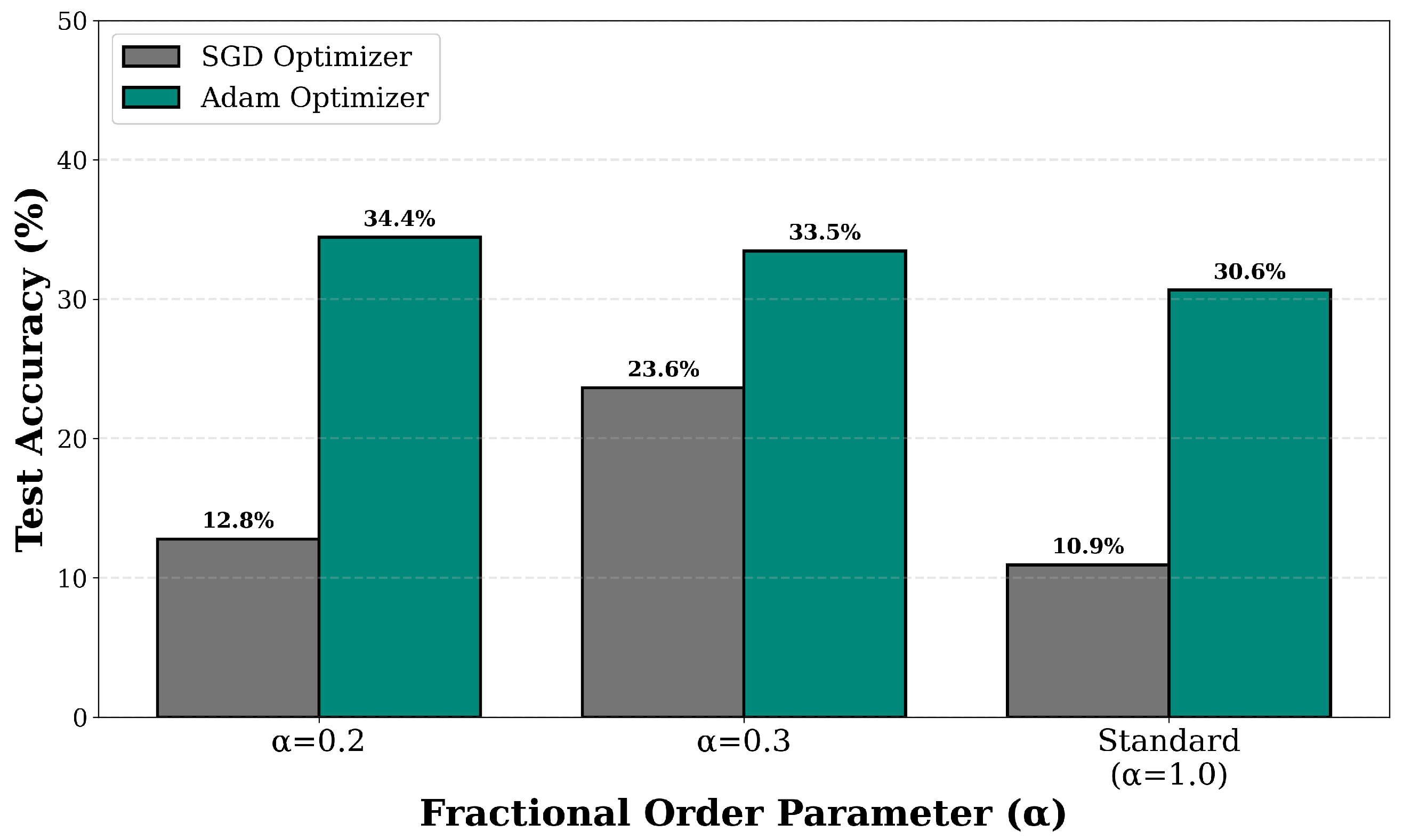 Third, theoretical foundation: Power-law decay emerges naturally and inevitably from the mathematics of fractional calculus, specifically from discretizing the Riemann–Liouville fractional integral that has been extensively studied in mathematical analysis for over a century. This provides rigorous mathematical grounding and connects the gradient weighting scheme to a rich body of theoretical results about fractional operators, memory effects, and long-range correlations in dynamical systems. Exponential decay, while widely used in optimization through momentum and moving averages, lacks comparable theoretical justification specifically for the intra-cycle gradient weighting problem. Our experimental results implicitly validate this theoretical comparison: standard Adam optimization employs exponential momentum with operating across parameter updates, and when combined with the power-law weighting within accumulation cycles, the two complementary temporal weighting mechanisms at different time scales yield superior results compared to either mechanism alone.