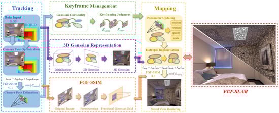 The processing pipeline begins with the 3D Gaussian Scene Representation module, where input data undergoes scene initialization and is transformed into a collection of anisotropic 3D Gaussians through a structured parameterization process. Through differentiable projective transformation, each 3D Gaussian is projected to a 2D Gaussian on the image plane for efficient rasterization. These Gaussian primitives collectively encode both geometric and photometric properties of the environment. Simultaneously, the Camera Pose Tracking module coordinates the relationship between pose estimation and rendering optimization. This module employs a combined ‘L1+FGF-SSIM’ loss formulation for iterative camera pose refinement, enabling accurate online pose estimation for sequential frames. The Keyframe Management module subsequently performs keyframe retrieval, selection, and pruning based on pose constraints and Gaussian visibility metrics, significantly enhancing the computational efficiency and reconstruction quality of the SLAM system. In the Mapping and Optimization module, FGF-SLAM optimizes Gaussian insertion and parameter updates using refined pose information from preceding stages. The optimization incorporates isotropic regularization to prevent excessive anisotropic deformation in under-observed regions, while utilizing a ‘L1+FGF-SSIM’ strategy to construct an analogous loss function for mapping. The FGF-SSIM component employs adaptive fractional orders that are dynamically adjusted via ATE monitoring, ensuring robustness across varying illumination conditions while preserving structural consistency and contrast sensitivity.