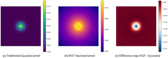 where represents the fractional order, controlling the degree of power-law attenuation. When , this kernel degenerates into a Gaussian kernel. represents the Gamma function as the fractional-order normalization factor. is the standard deviation of the Gaussian term, which controls the intensity of Gaussian attenuation. represents the integer displacement coordinates of pixel p relative to the central pixel .
