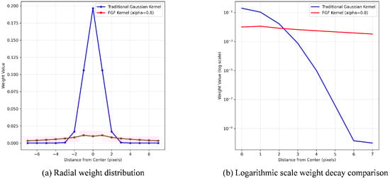 Figure 3 presents a comparative analysis of the radial weight distribution between the Gaussian kernel and the FGF kernel, highlighting quantitative differences in their spatial weighting characteristics. Figure 3a shows one-dimensional profiles extracted from the center of each kernel, plotting weight value as a function of radial distance. The Gaussian kernel exhibits a steep exponential decay, with values declining rapidly from the center. In the immediate vicinity (0–2 pixels), the conventional Gaussian kernel maintains higher weight values, providing superior emphasis on local pixel relationships. In contrast, the FGF kernel demonstrates a more gradual attenuation, maintaining substantially higher weights at medium to large distances. This behavior confirms the stronger long-range memory characteristics of the FGF kernel. Figure 3b displays the same data with weight values converted to a logarithmic scale. In this representation, the Gaussian kernel closely follows an approximately straight line, consistent with its exponential nature. The FGF kernel, by contrast, exhibits a slowly curving trajectory indicative of power-law decay. This fundamental trade-off between local precision and global context capture represents a deliberate design choice in the fractional Gaussian formulation, where the benefits of extended receptive fields outweigh the minor reduction in local emphasis for VSLAM applications. This slower attenuation rate, a defining feature of heavy-tailed distributions, enables the FGF kernel to integrate information from longer distances, thereby facilitating enhanced structural preservation in image processing.