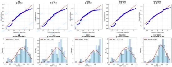 Figure 4 presents a normality assessment of Structural Similarity (SSIM) index distributions across five image denoising methodologies. The upper row displays quantile-quantile (Q–Q) plots, while the lower row shows corresponding histograms with fitted normal distributions, collectively characterizing the statistical distribution of each method. Although all Shapiro–Wilk test results (L2: ; L1: ; SSIM: ; MS-SSIM: ; FGF-SSIM: ) indicate significant deviations from normality (), the FGF-SSIM method exhibits notably superior distributional characteristics. Its Q–Q plot demonstrates the closest alignment with theoretical normality benchmarks, and the histogram confirms the most symmetric and well-shaped distribution profile among all evaluated methods. Although FGF-SSIM does not achieve complete normality, this distributional advantage provides critical justification for employing distribution-free statistical tests in subsequent analyses. Furthermore, these foundational distributional properties establish the necessary context for interpreting differential effect sizes in methodological comparisons, suggesting that FGF-SSIM’s enhanced distributional stability may contribute to more consistent performance advantages.