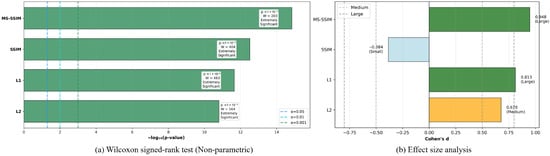 Figure 5a presents the results of Wilcoxon signed-rank tests comparing the proposed FGF-SSIM method against four established denoising approaches. The bar chart summarizes the statistical significance of pairwise comparisons, with all p-values for FGF-SSIM versus L2, L1, SSIM, and MS-SSIM falling below . This uniformly high level of statistical significance across all comparisons provides robust non-parametric evidence of systematic performance differences. The use of this distribution-free test is directly justified by the non-normal distribution characteristics established in Figure 4, ensuring valid statistical inference despite violations of parametric assumptions. The consistently minimal p-values anticipate the substantial effect sizes quantified later, particularly in comparisons against L1 and MS-SSIM, where the fractional Gaussian field kernel demonstrates superior structural preservation. These statistically significant outcomes are consistent with the methodological strengths of FGF-SSIM, which integrates fractional-order denoising, large-kernel filtering for long-range dependencies, and multi-feature fusion for illumination robustness. The agreement between the distributional characteristics established in Figure 4 and the non-parametric significance testing in Figure 5a provides strong evidence for the method’s consistent performance. This rigorous statistical foundation, which confirms a systematic advantage, is further complemented by an analysis of the practical effect magnitudes in the following section.