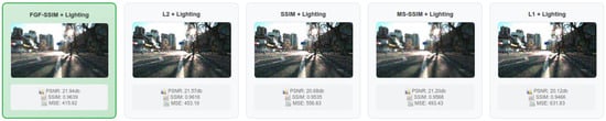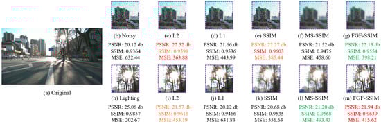 Figure 6 compares the illumination robustness of FGF-SSIM with other loss functions on the urban01 scenario of the M2UD dataset []. Under consistent experimental conditions, we provide qualitative comparisons by presenting the resulting output images generated by each loss function. Additionally, we evaluated the proposed FGF-SSIM loss function against other loss functions using three standard image quality metrics: PSNR, SSIM, and MSE. After increasing the original image’s illumination intensity by 30%, the proposed FGF-SSIM loss preserves structural details more effectively than competing loss functions and achieves superior performance across multiple evaluation metrics.The results demonstrate that incorporating fractional-order calculus into SSIM significantly enhances algorithmic performance under real-world illumination variations. FGF-SSIM achieves the optimal performance, marginally surpassing the L2-based results and substantially outperforming conventional SSIM. Specifically, under a 30% luminance adjustment, FGF-SSIM attains peak metrics of 21.94 dB PSNR, 0.9639 SSIM, and 415.62 MSE, exceeding the L1 algorithm by 1.82 dB PSNR, 0.173 SSIM, and 216.21 MSE. This improvement stems from fractional-order local statistics in FGF-SSIM, which replaces first-order Gaussian convolution kernels in traditional SSIM with fractional-order counterparts for decoupled luminance-contrast-structure control. The power-law decaying weights confer long-range dependence to capture non-local illumination changes, while Gaussian attenuation preserves local details and smoothness, enabling robustness to global illumination variations without compromising structural fidelity.