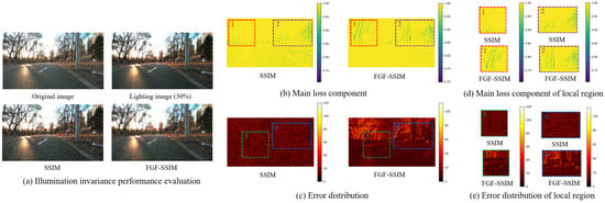 Figure 8 presents the illumulation invariance performance evaluation between the SSIM and FGF-SSIM metrics applied to the urban03 scene from the M2UD dataset [], alongside a comparative decomposition analysis. To underscore the advantages of incorporating fractal calculus into the SSIM framework, we provide a detailed examination of the principal loss components and error distributions of both methods. As illustrated in Figure 8a, both methods are evaluated under a 30% global illumination increase. The results demonstrate that FGF-SSIM exhibits significantly greater robustness to illumination variations. Images processed with FGF-SSIM appear more natural and sharper, with better preservation of structural details such as edges and textures. Figure 8b presents the Main Loss Component, which corresponds to the luminance computation segment of each loss function. The luminance error distribution of FGF-SSIM more effectively captures inter-object illumination variations, indicating its superior ability to maintain the global luminance structure of the scene. In Figure 8d, two localized regions are magnified for direct comparison. FGF-SSIM more accurately renders the brightness of fine structures such as background branches, thereby contributing to improved illumination invariance in the final output. Figure 8c compares the error distributions of both methods relative to the ground truth image. FGF-SSIM achieves lower and more uniformly distributed errors, confirming its higher reconstruction quality. This improvement is attributed to the long-range memory characteristics of FGF-SSIM, which enhance its capacity to preserve global structural information and fine details while effectively smoothing homogeneous regions. Figure 8e provides an additional zoomed-in comparison of two local patches. While SSIM fails to retain structural object details, FGF-SSIM clearly maintains the object’s structure, further corroborating its stability under illumination changes. Illumination variation constitutes a global monotonic transformation of pixel values. Although it significantly alters absolute intensity values, relative structural relationships within the image remain largely intact. FGF-SSIM leverages a fractional Gaussian field kernel endowed with long-range memory properties, enabling a wider receptive field. This allows the model to incorporate broader contextual information when estimating local luminance, emphasizing relational structural cues over absolute pixel values.