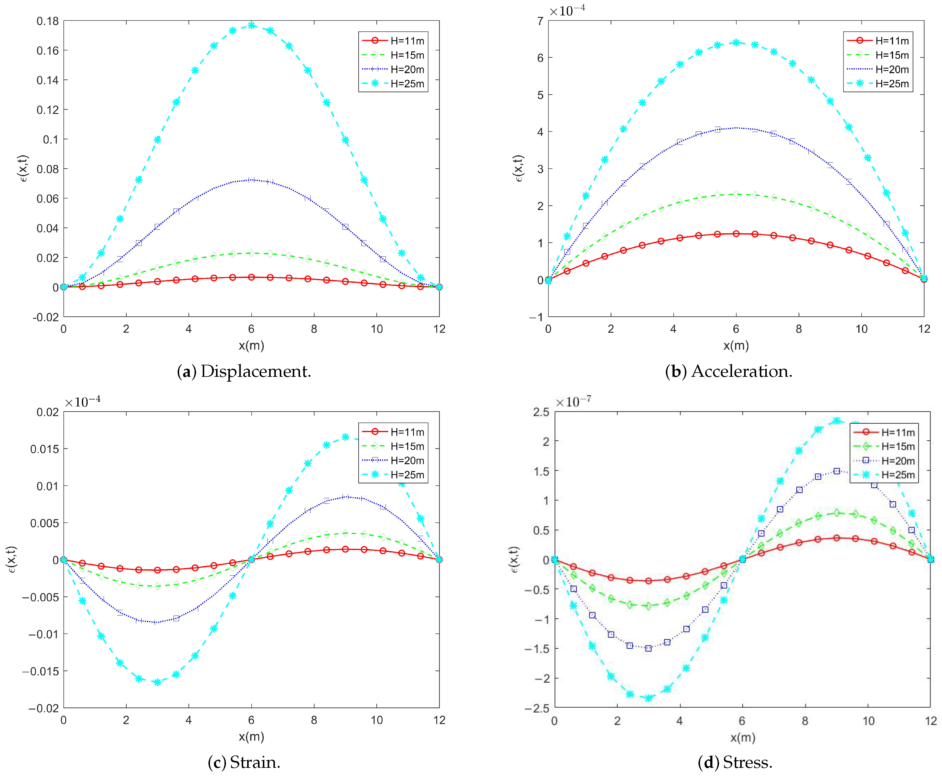 - Numerical results indicate that both fluid velocity and external loading significantly affect pipe displacement with increases in either factor leading to larger deformations over time. In addition, pipe length amplifies displacement, acceleration, strain, and stress in a nonlinear manner with peak responses typically occurring near the midspan.