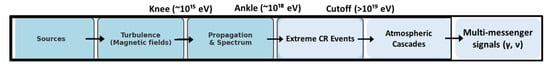 Turbulence and cascade physics act as the “filter” between CR sources (particle acceleration and particle propagation) and what we observe. Turbulent magnetic fields control how CRs propagate and shape spectral features like the knee and ankle, while cascades—in both the interstellar medium and the atmosphere—dictate how extreme CR events manifest in secondary particles. A concept diagram is given in Figure 2, showing how CR sources connect through turbulence and cascades to the observable spectrum and signals [].
