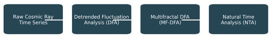 In the following, to analyze the intrinsic properties of the CR time series, advanced analytical methods, including Detrended Fluctuation Analysis (DFA) and Multifractal Detrended Fluctuation Analysis (MF-DFA), will be employed (Figure 3). These techniques are often used to investigate self-similarity and the spectrum of singularities within the datasets []. Based on the fractality regime of CRs, the Natural Time Analysis (NTA) will be used to perform real-time fractal behavior analysis of the ECREs.