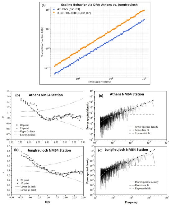 (a) The Fd (τ) of DFA2 in a log–log plot for the Athens NM64 Station with the fit equation ψ = 1.03χ − 1.62 (R2 = 0.992) and for the Jungfraujoch NM64 Station (bottom) with ψ = 1.07χ − 1.22 (R2 = 0.994). (b) Local slopes α of logFd (τ) vs. logτ for both stations, indicating 2σ intervals with dashed gray lines. (c) The power spectral density for the Athens NM64 Station includes power-law and exponential fits, with ψ values of ψ = 7.81 × 10−7χ−1.36 (R2 = 0.50) and ψ = 4.79 × 10−5 e−7.1χ (R2 = 0.35). For Jungfraujoch NM64 Station, the fits are ψ = 4.23 × 10−5χ−1.75 (R2 = 0.49) and ψ = 1.09.79 × 10−2 e−9.9.1χ (R2 = 0.56).