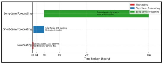 The successive compressions of the fractal memory into long-, medium-, and real-time inference are prediction, forecasting, and nowcasting. We are generally more familiar with “forecast” than “nowcast.” Here is a brief overview of the time scales and data sources for both. As illustrated in Figure 6, nowcasting (shown in red) refers to a time scale of up to 6 h, and it uses real-time satellite data to track solar particles and X-ray bursts. Short-term forecasting (shown in blue) refers to a time scale, from 6 h to 3 days, and it is based on monitoring solar flares, coronal mass ejections, and heliospheric models. Finally, the long-term forecasting (shown in green) refers to a time scale from weeks to months, and it relies on sunspot cycles, magnetic field changes, and statistical solar activity models. Both approaches have limitations. As far as the forecast limitation is concerned, predicting particle acceleration near the Sun is challenging due to the complexity of the modeling. The nowcast limitation refers to the fact that it offers minimal warning, as high-energy particles can reach Earth within minutes of a solar flare.