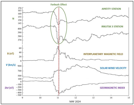 On 10–11 May 2024, a significant geomagnetic storm occurred, accompanied by a substantial decrease in GCR intensity, which sparked scientific curiosity due to its rarity. This event was particularly noteworthy because a comparable occurrence was last observed nearly two decades prior (see [] for further details).