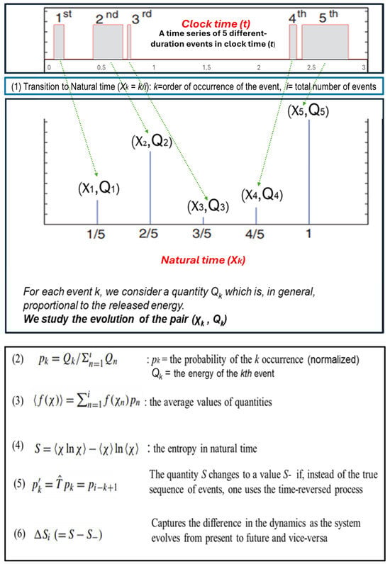 Building on the confirmed fractal dynamics of CR intensity, we utilize the NTA tool, which is specifically designed to detect critical phenomena by focusing on the order and “energy” (intensity) of events, providing a complementary approach to scaling analysis. A sophisticated idea is to convert the CR time series shown on the top of the upper part of Figure 8 to a new series shown just below it as follows: with (1), we define an index χk = k/i, where k is the order of occurrence of each event and i is the total number of events. The second step is to analyze the evolution of the pair (χk, Qk), where Qk is the energy of the kth event, and then define probabilities with (2). The average quantities are derived from (3), and with (4), the entropy S in natural time is calculated at different intervals of natural time. Next, the entropy S- under time reversal is calculated using (5). Finally, we explore the difference ΔSi, denoting the dynamics, when transitioning from the present to the future and vice versa [,].