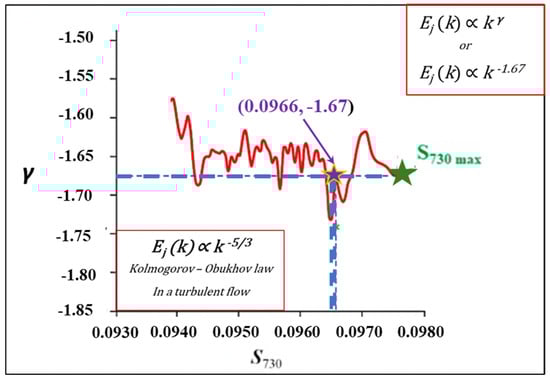As shown in Figure 9, the power-law exponent γ of the power spectral density of the entropy sequence was determined for each window. Results showed that γ ranges from −1.74 to −1.57, with an entropy value (S730 = 0.0966) at γ = −1.67 (≈−5/3)—a hallmark of a stationary system emitting uncorrelated energy bursts. It should be remembered that the entropy of the uniform distribution Su can be calculated as follows: Su = (ln2)/2 − 1/4 ≈ 0.0966. Therefore, S730 = Su.
