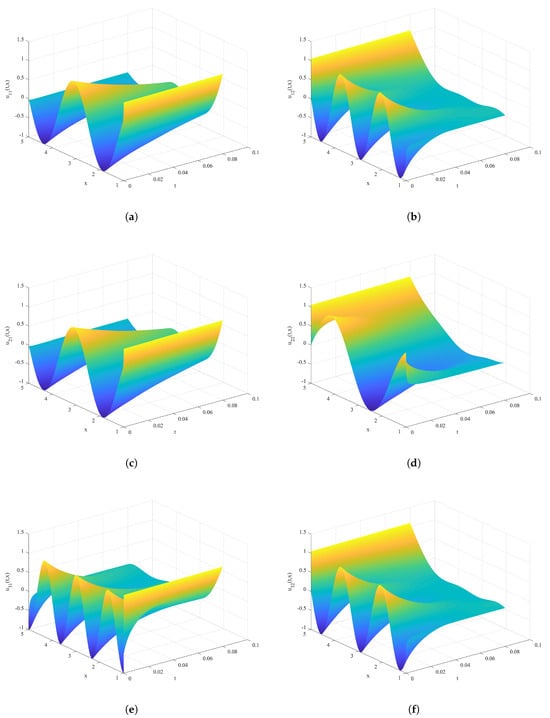 The time–space state of neurons in coupled fractional-order MRDNNs (2) is shown in Figure 3. The color scheme employed in this figure corresponds to a value-to-color mapping, with the same convention used for Figure 4 and Figure 5. We aim to synchronize the trajectory of each neuron in Figure 4 on the trajectories shown in Figure 3.