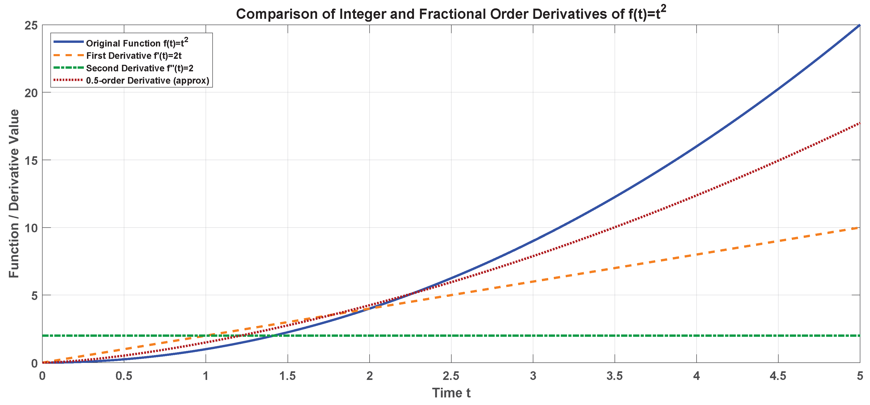 illustrates that the derivative of 0.5-order falls between the original function and its derivatives of integer-order, showcasing the intermediate and flexible nature of fractional calculus. This makes fractional controllers particularly effective for vibration suppression in civil engineering applications.