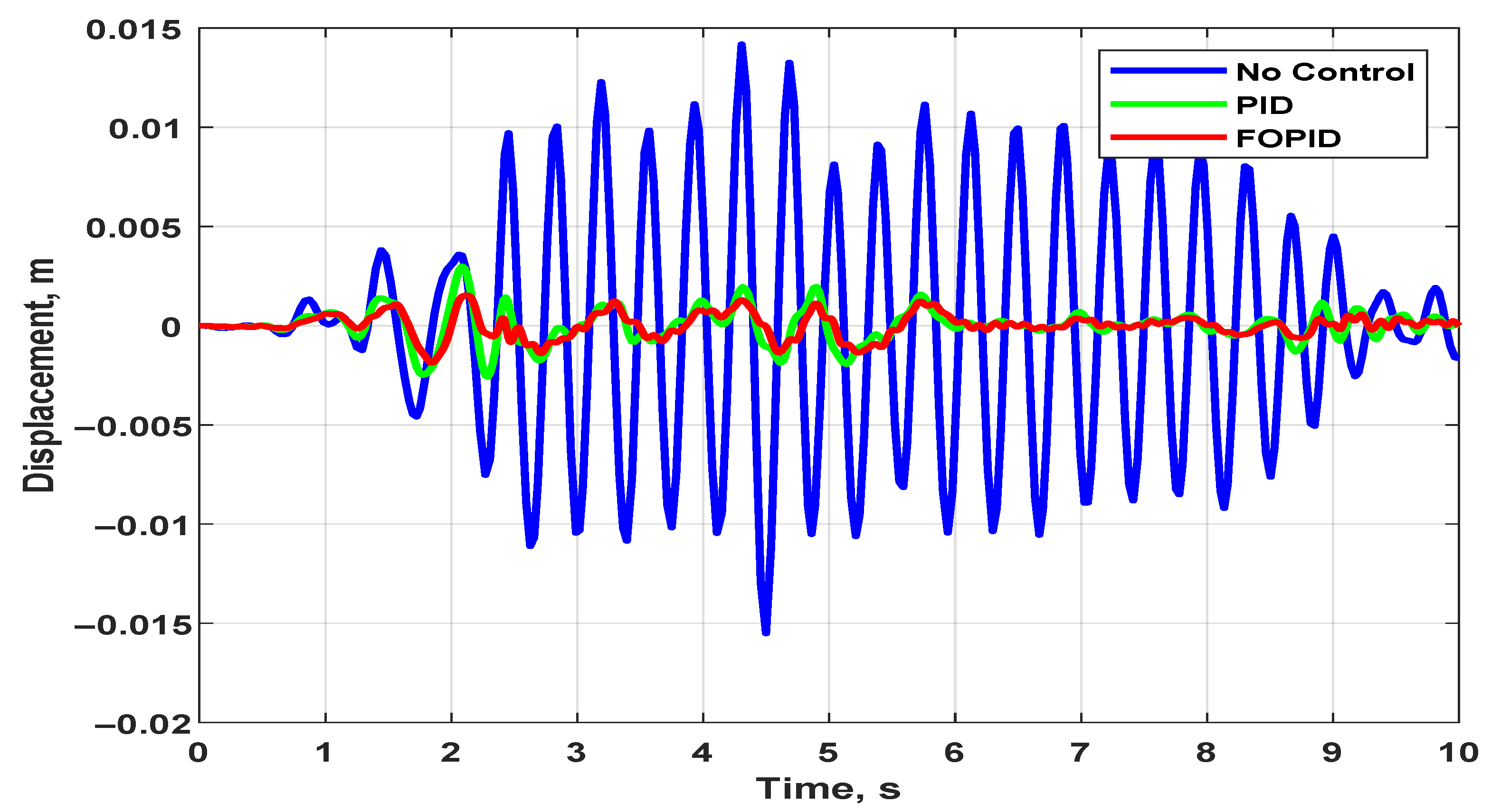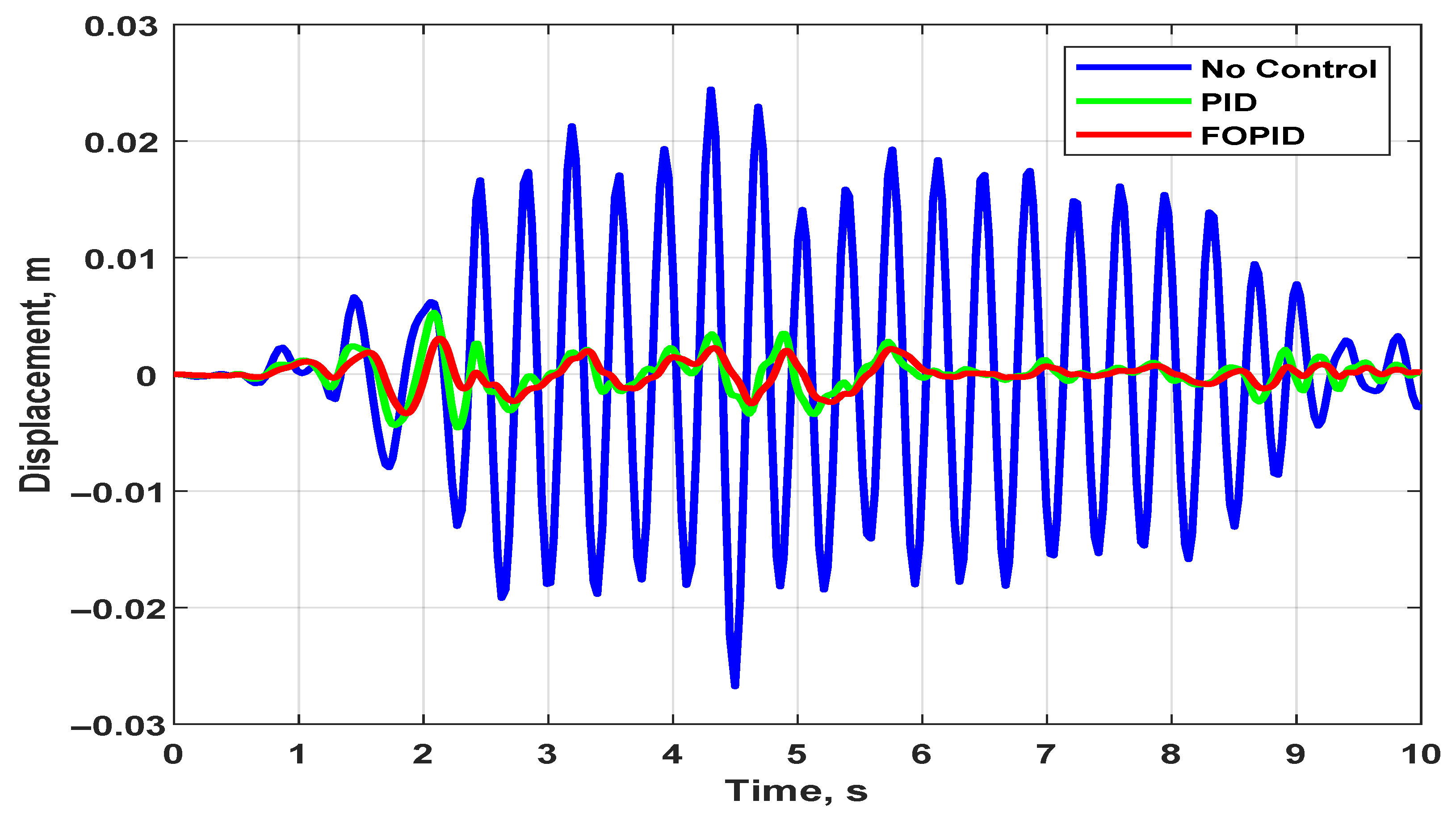 Figure 9. Comparisons of three cases, namely, no control, PID control, and FOPID control, are presented. The uncontrolled structure tends to be characterized by the highest displacement amplitudes, while the PID controller reduces these vibrations to a significant extent. The maximum reduction is obtained from the FOPID controller, and it shows a better damping capability with enhanced vibration mitigation performance.
