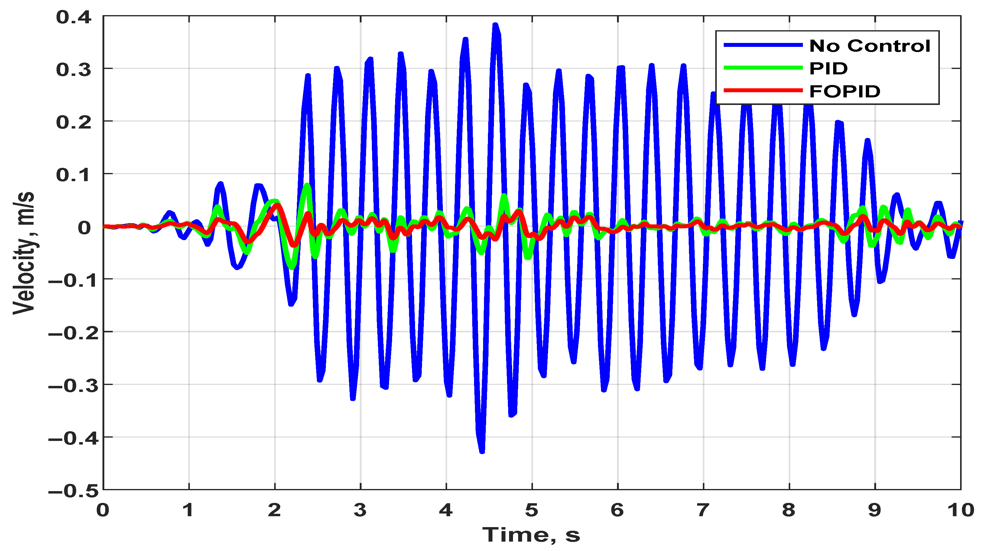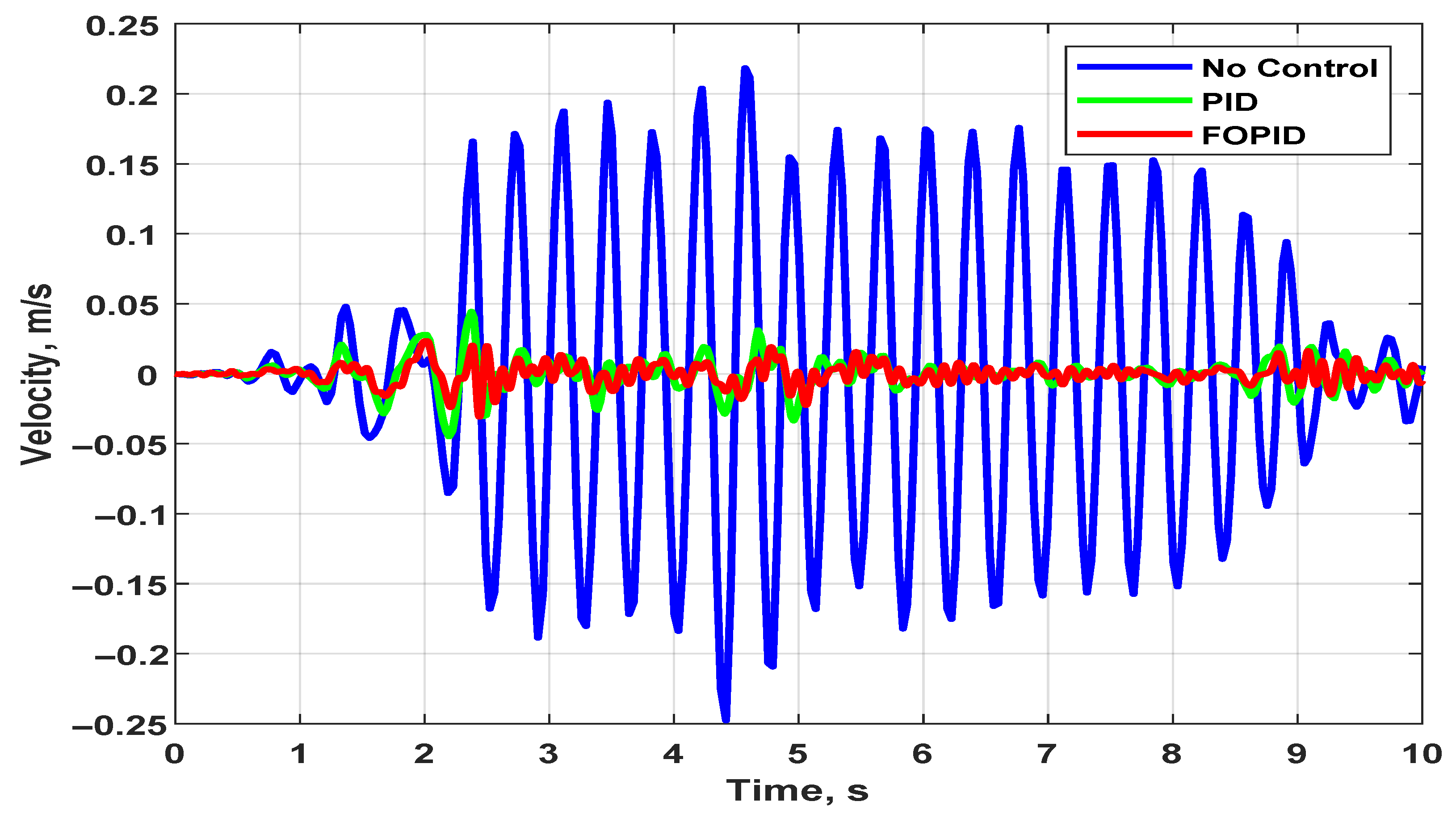 Table 4 compares the RMS values of displacement and velocity. The FOPID controller results in the least RMS values on both floors. This reveals the highly improved vibration reduction achieved with the FOPID controller.