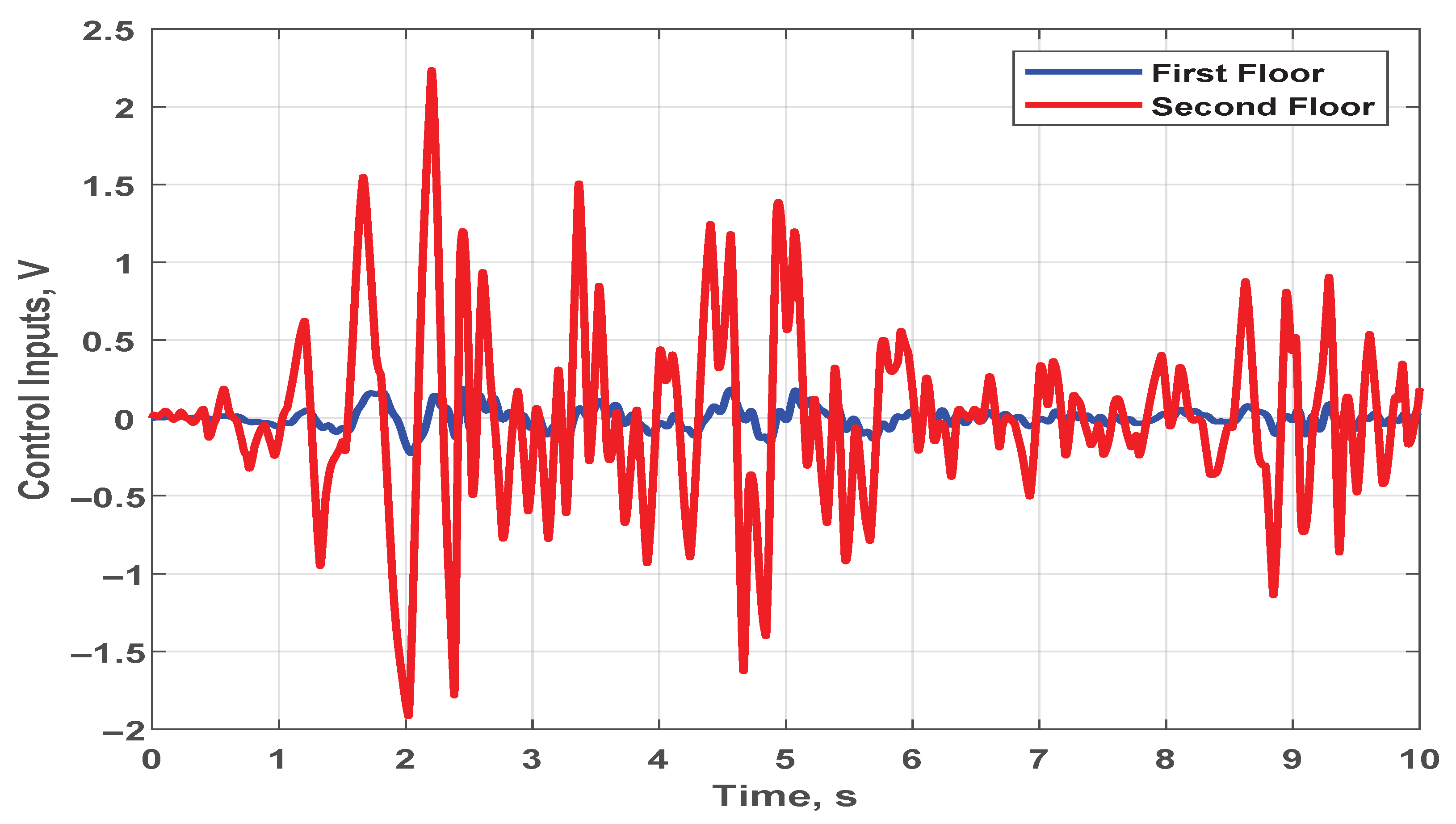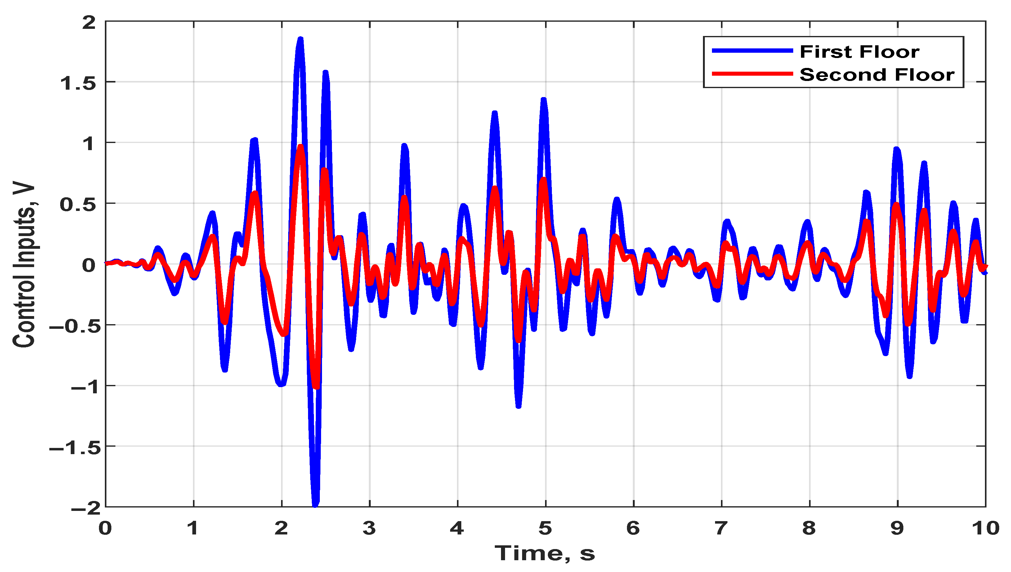 Figure 12 shows the control input signals applied to the first and second floors over a period of 10 s. Both inputs fluctuate approximately between c2 V and +2 V, indicating active control efforts to regulate the motion of the system. The input of the first-floor control shows slightly larger variations and thus seems to have required more corrective action at that level. In contrast, the second-floor input seems smoother and hence behaves more stably. In summary, this figure indicates how differences in control forces are used between floors to balance the system performance.