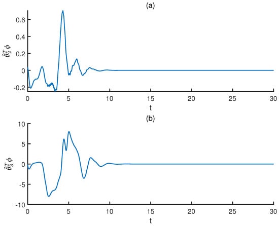 - Compared with the results in [,,,,] which considered the unknown function by fuzzy logic system, combining the Szász–Mirakyan operator with adaptive law, which is invoked in our paper, is a simple and effective method to deal with the difficulties brought by unknown functions.