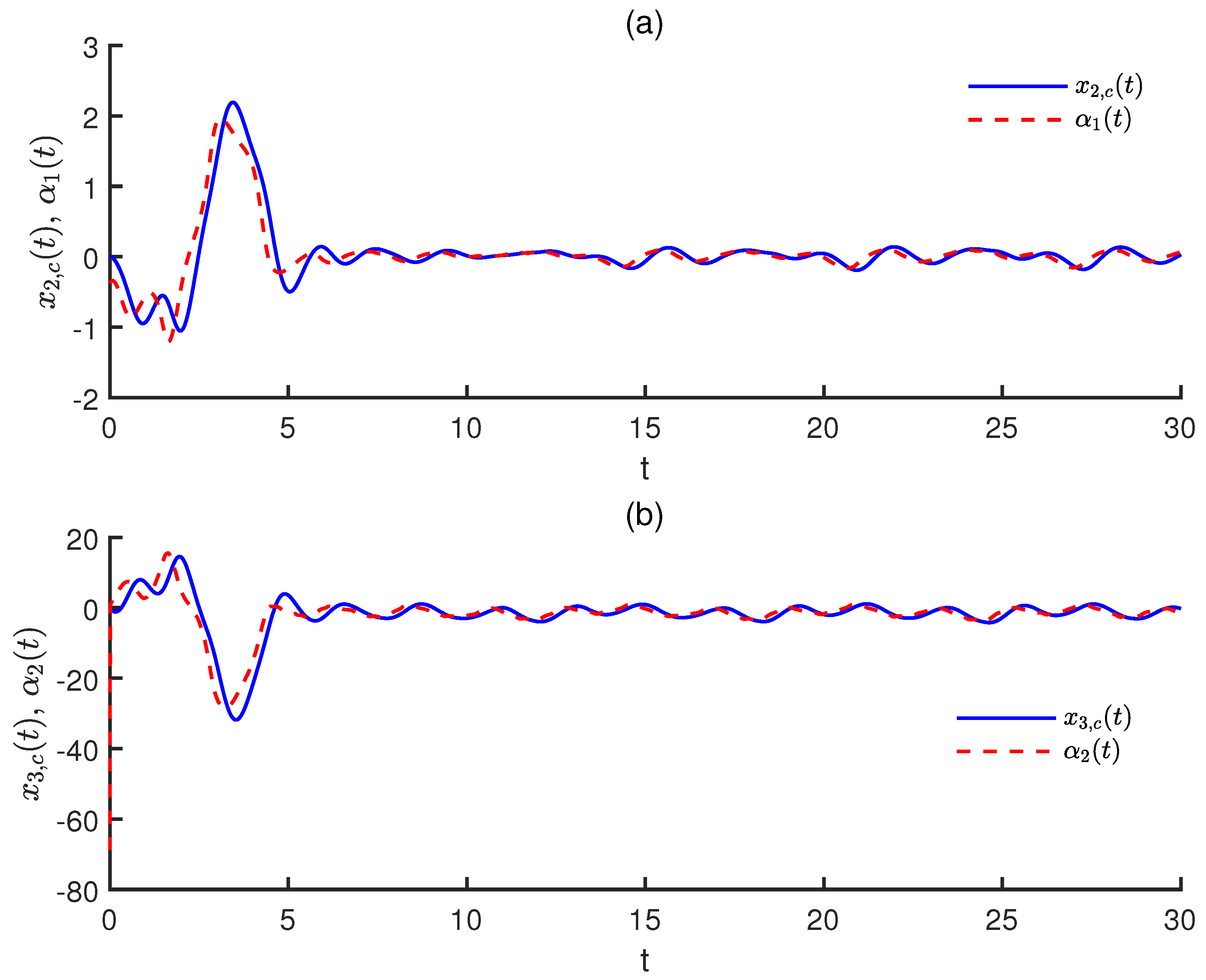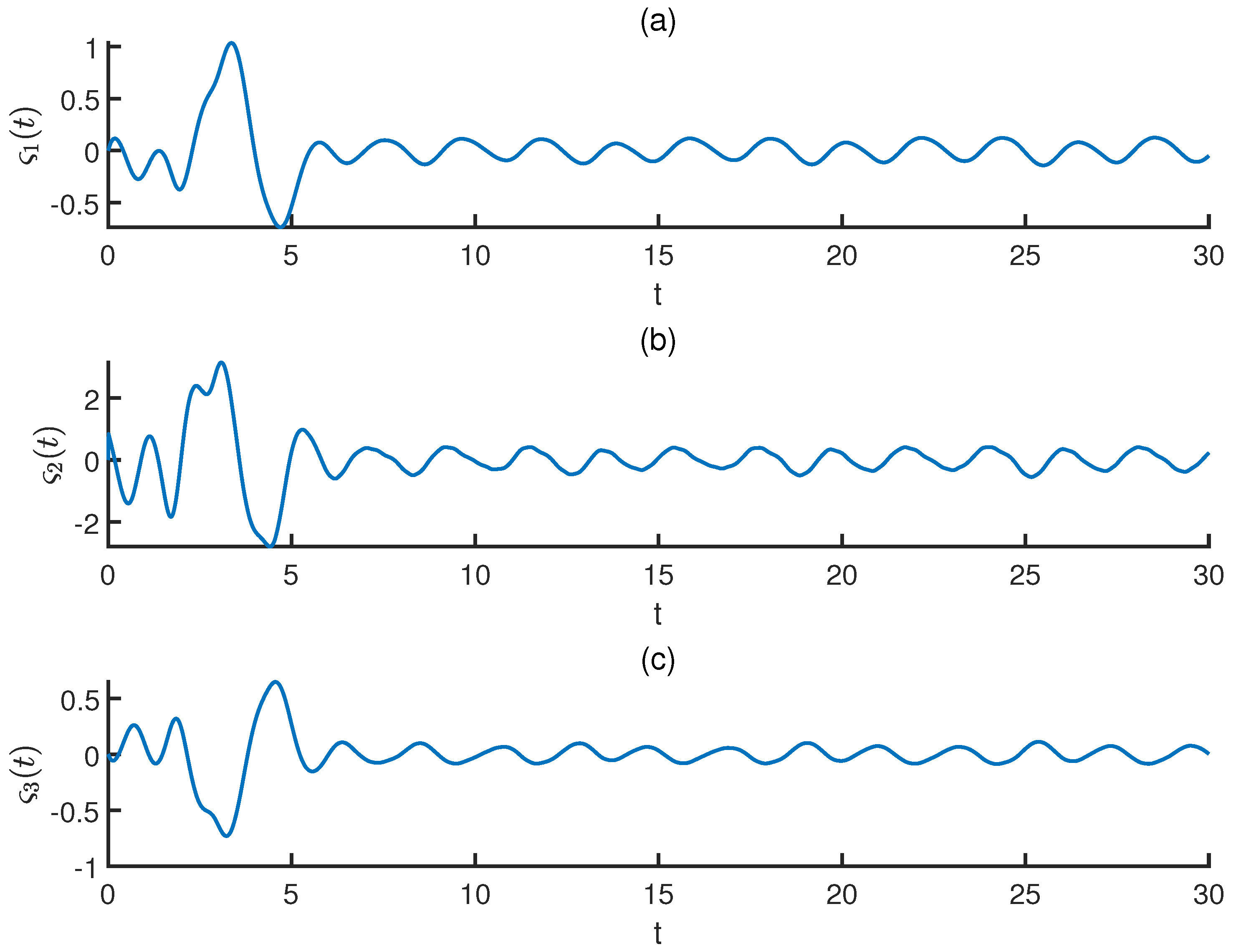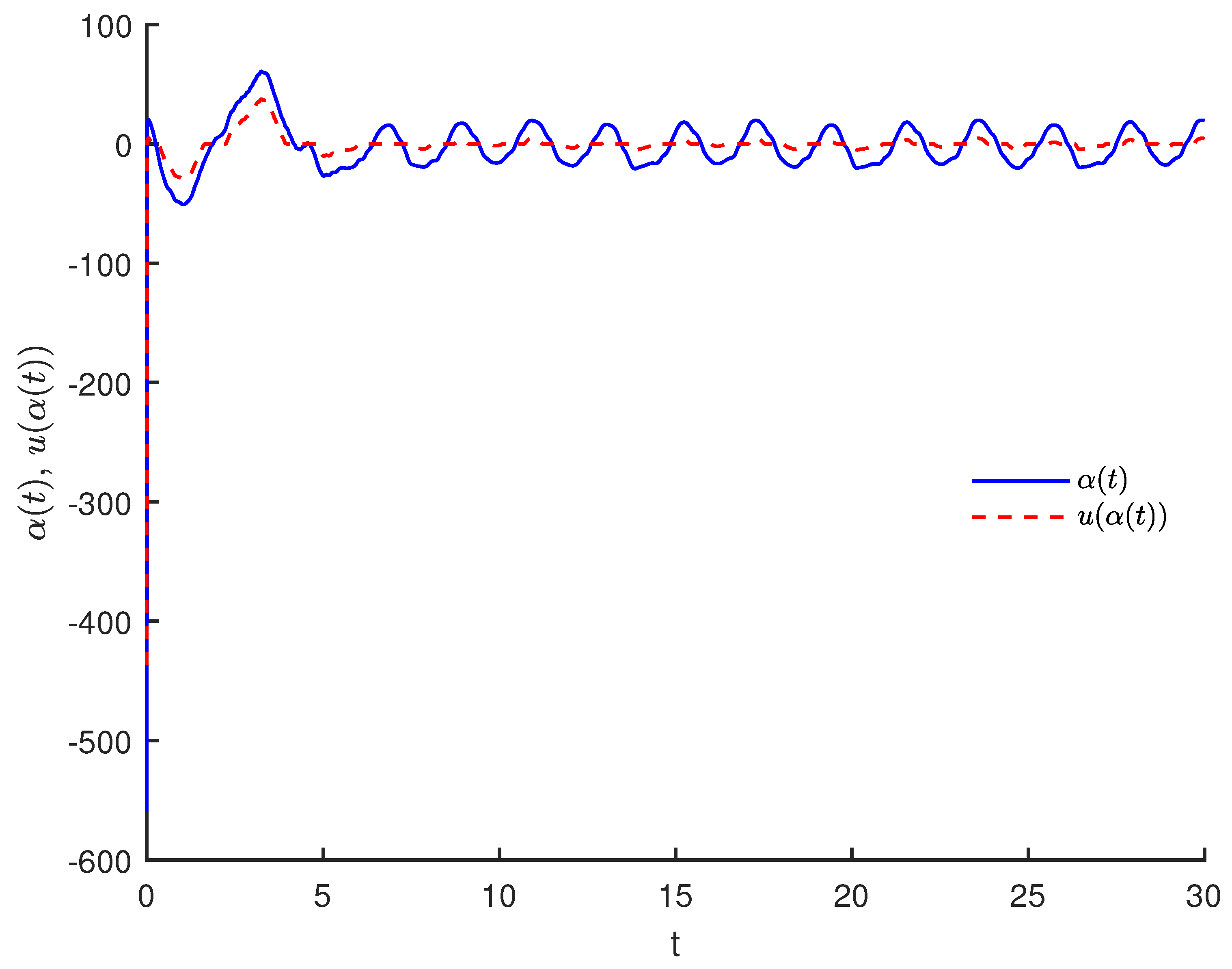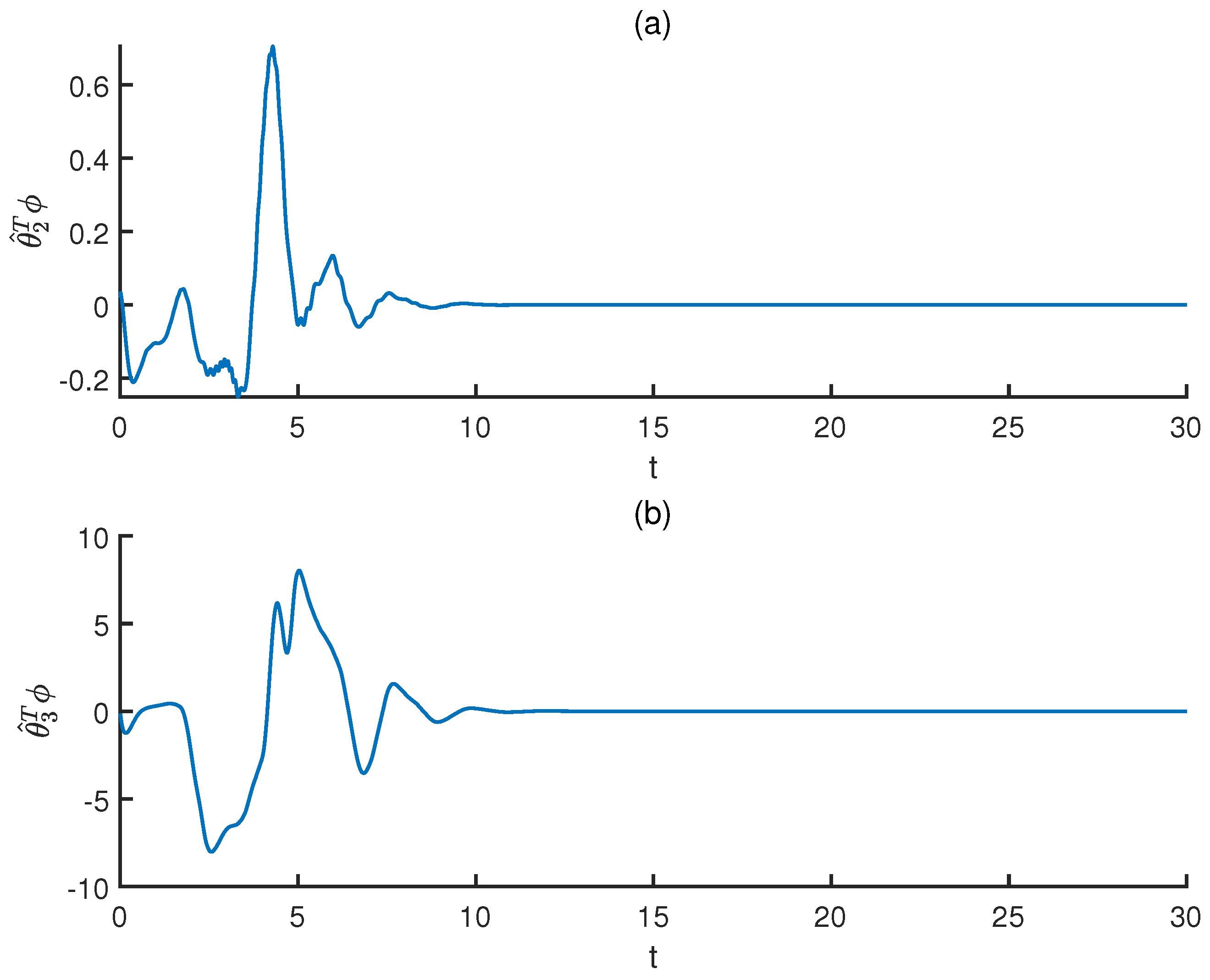 Remark 4. In dealing with the dead zone, Ref. [35] need the following condition (see formula (72) in Ref. [35]),with is positive. It results in the being positive, which is contradicts belonging to in Definition 5 in Ref. [35]. In our paper, we treated the bounded part of the dead zone as a function with an upper bound which can allow to be either positive or negative. 4. Numerical Simulation