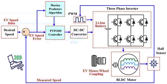 The power stage is the central component of an EV drive system. To move the wheels, it must convert the electrical energy stored in the battery into mechanical motion. Accurately controlling the speed of BLDC motors in EVs depends on the proper coordination of key elements (controller, optimization strategy, feedback loop). The system modeling and the operational process components are illustrated in Figure 1. The system is powered by a lithium-ion battery, serving as its primary power source. The battery supplies a steady DC voltage needed to drive the inverter and the controller. The BLDC motor is mechanically coupled to the EV wheel, transmitting electrical input into rotational motion.