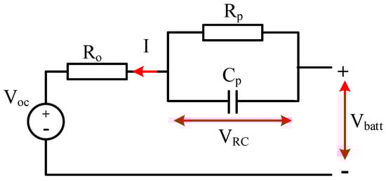 An effective rechargeable battery, the lithium-ion (Li-ion) battery, transports lithium ions from the anode to the cathode during discharge and back again during charging. In this study, the Thevenin-based first-order RC model was selected to represent the lithium-ion battery due to its effectiveness in balancing modeling accuracy with simulation simplicity. The mathematical model of a Li-ion battery used in EVs usually comprises the electrical behavior of the battery, taking into account its internal dynamics and nonlinearity. The equivalent circuit model of a Li-ion battery, as shown in Figure 2, consists of parallel RC networks that describe the battery’s dynamic behavior, a series resistance, and a voltage source representing the open-circuit voltage (OCV). According to Kirchhoff’s law, the current flowing through the RC network is expressed as []: