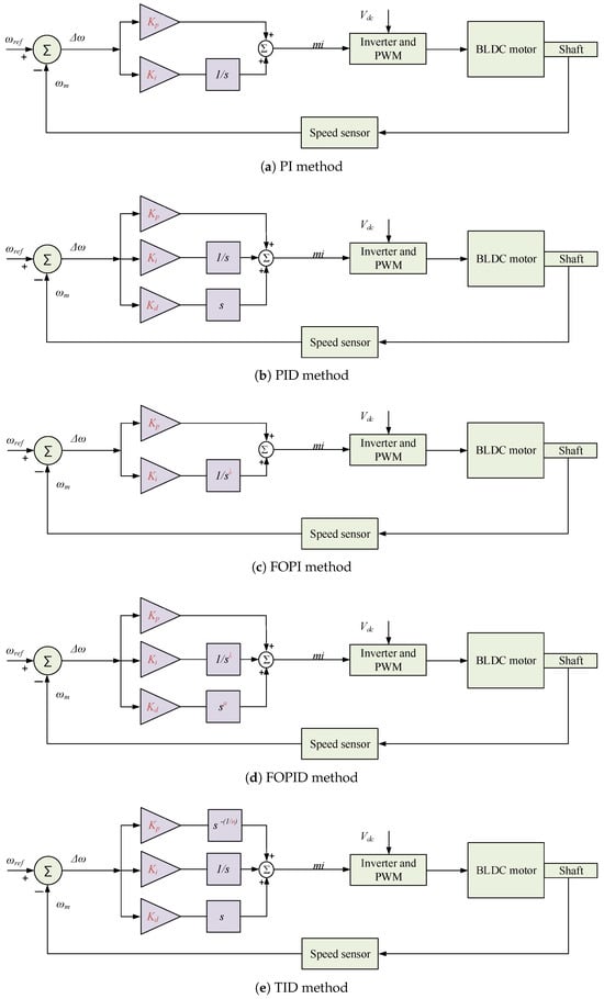 IO-based speed control has been widely applied in motor drives, where PI and PID are the most common types. The PI includes only two tunable parameters (proportional gain and integral gain ). Figure 3a shows the PI BLDC speed controller, and it is expressed as: