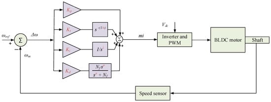 Some limitations of IO, PI, and PID controllers include reduced design flexibility, limited disturbance rejection capabilities, and deteriorated performance in the presence of uncertainties. However, FO-based control schemes have been proven to perform better compared to their IO PI and PID counterparts. The FOPI has one more tunable parameter (integrator FO operator ) in addition to the two tunable gains ( and ). Figure 3c shows the FOPI BLDC speed controller, and it is expressed as: