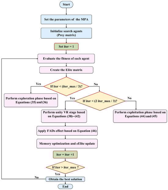 The primary impact of MPA is the shared hunting behavior of sea predators. Predators employ two distinct strategies when attacking their prey: Lévy and Brownian motions []. The Lévy strategy searches mostly with short steps, occasionally making long jumps. In contrast, Brownian motion covers the area using more uniform and consistent steps compared to Lévy walks. Therefore, the Lévy strategy is more suitable for exploitation, while Brownian motion is more effective for exploration. To integrate these two strategies, predators adjust their approach according to the velocity ratio of their prey relative to themselves. A flowchart illustrating the MPA is presented in Figure 5 []. The development steps of the MPA will be explained in the subsections below.
