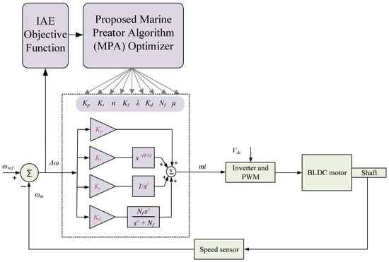 Based on the above-discussed speed controllers for BLDC motors, fractional-order (FO)-based speed controllers offer higher design freedom and flexibility due to their inherent FO operators. However, the hybridization of existing controllers makes it possible to merge the best characteristics of each one. In addition, the design of sophisticated FO controllers is a critical issue compared to the possible simpler design processes of integer-order-based controllers. Existing design methods in the literature for non-integer controllers are complex and need a unified design process. Instead, metaheuristic optimizers have proven to be a suitable and efficient approach for designing complex control methods in various applications. In addition, they can provide an optimal set of parameters together, rather than optimizing parameters individually, leading to a guaranteed optimal design. The Marine Predators Algorithm (MPA) was recently developed. The MPA optimizer has proven to improve designs in several applications. This paper also presents the first application of MPA in motor speed control design.