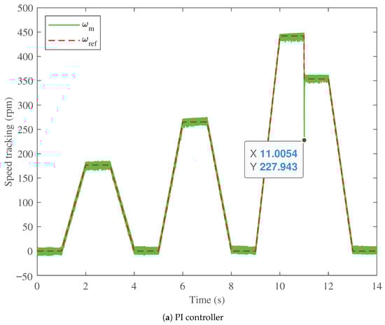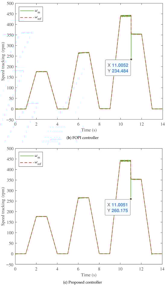 The test speed drive cycle is applied to the BLDC with the optimum parameters of the proposed PTFOIDN controller. Also, the proposed PTFOIDN BLDC control is compared with the optimized PI and FOPI at the same drive cycle. The obtained BLDC speed tracking performance is shown in Figure 8. The speed tracking for the PI speed control is shown in Figure 8a, for the FOPI speed control in Figure 8b, and the proposed PTFOIDN BLDC control in Figure 8c. It can be observed that the PI control exhibits the lowest speed tracking performance, accompanied by the highest speed fluctuations. With the speed step down at time 11 s, the PI-based speed controller drops to 227.943 rpm.