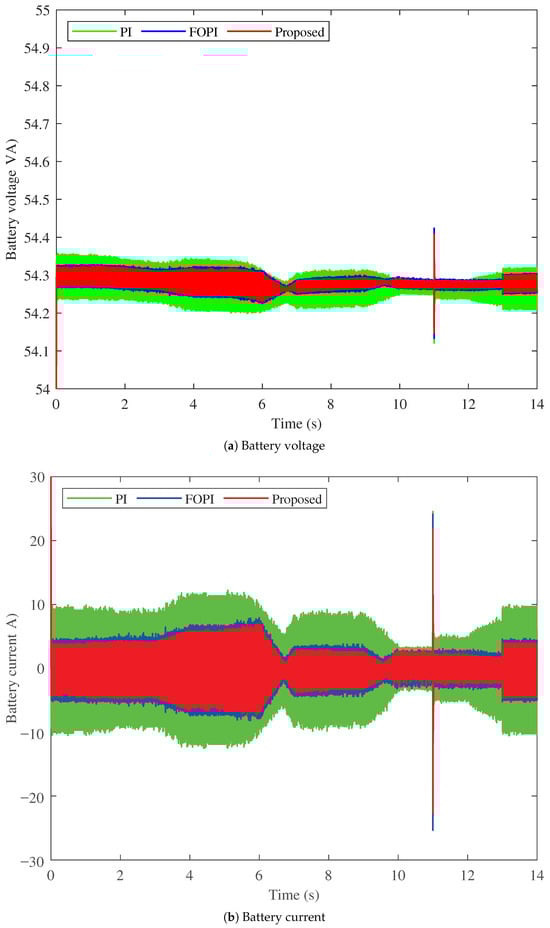 Another comparison is made in terms of the battery side (input DC source) for the electromobility application between the three controllers, as shown in Figure 12 and Figure 13. The performance of the battery voltage of the three controllers is shown in Figure 12a. The PI controller (in green) has the highest battery voltage ripple among the three controllers, followed by the FOPI controller. The proposed PTFOIDN BLDC speed control (in red) has the lowest battery voltage ripple. In addition, it exhibits the lowest battery voltage spike at 11 s, compared to the PI and FOPI controllers.