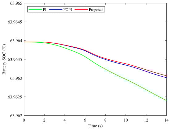 The battery SoC for the three controllers for the drive cycle is compared in Figure 13. It can be seen that the high-power absorption of the PI results in a lower SoC at the end of the drive cycle, which means more charging cycles with continuous operation and reduced lifetime accordingly. The FOPI and the proposed PTFOIDN BLDC speed controller have higher SoC at the end of the drive cycle. The proposed PTFOIDN controller has a slightly higher SoC compared to FOPI. However, with continuous operation, this difference becomes higher. Therefore, a longer battery lifetime can be achieved through long-term continuous operation.