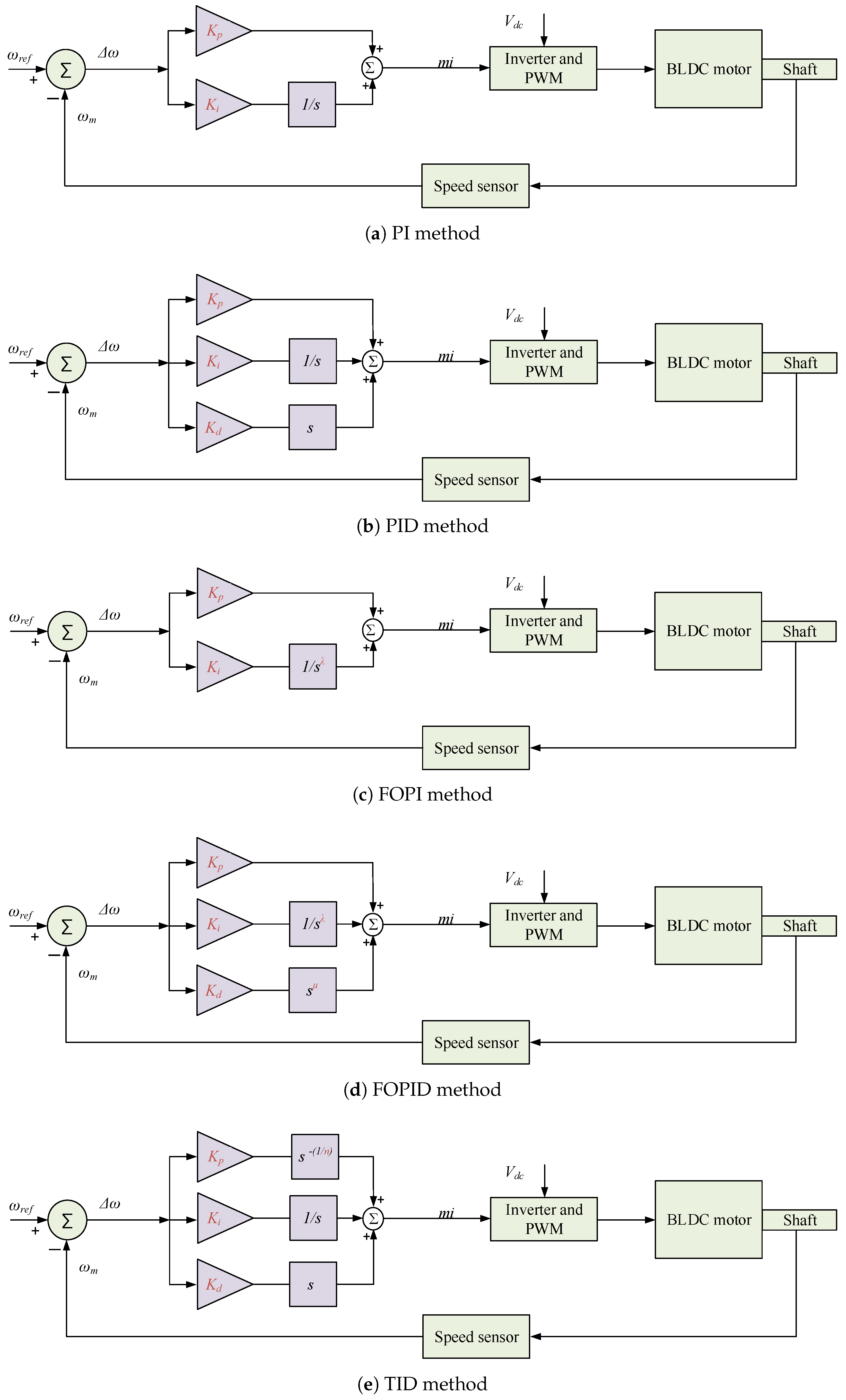 - Sayed, K.; El-Zohri, H.H.; Ahmed, A.; Khamies, M. Application of Tilt Integral Derivative for Efficient Speed Control and Operation of BLDC Motor Drive for Electric Vehicles. Fractal Fract. 2024, 8, 61. [Google Scholar] [CrossRef]