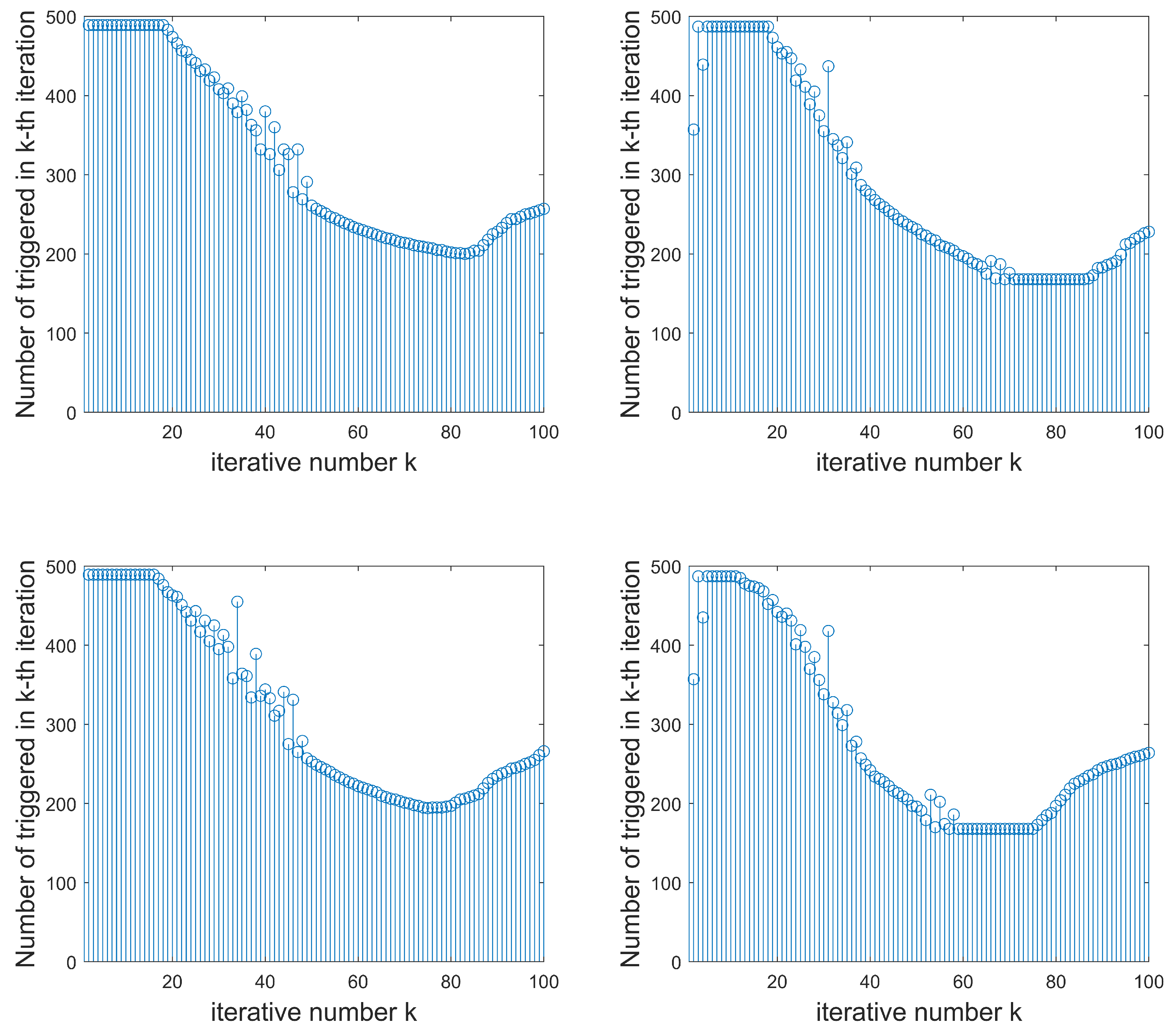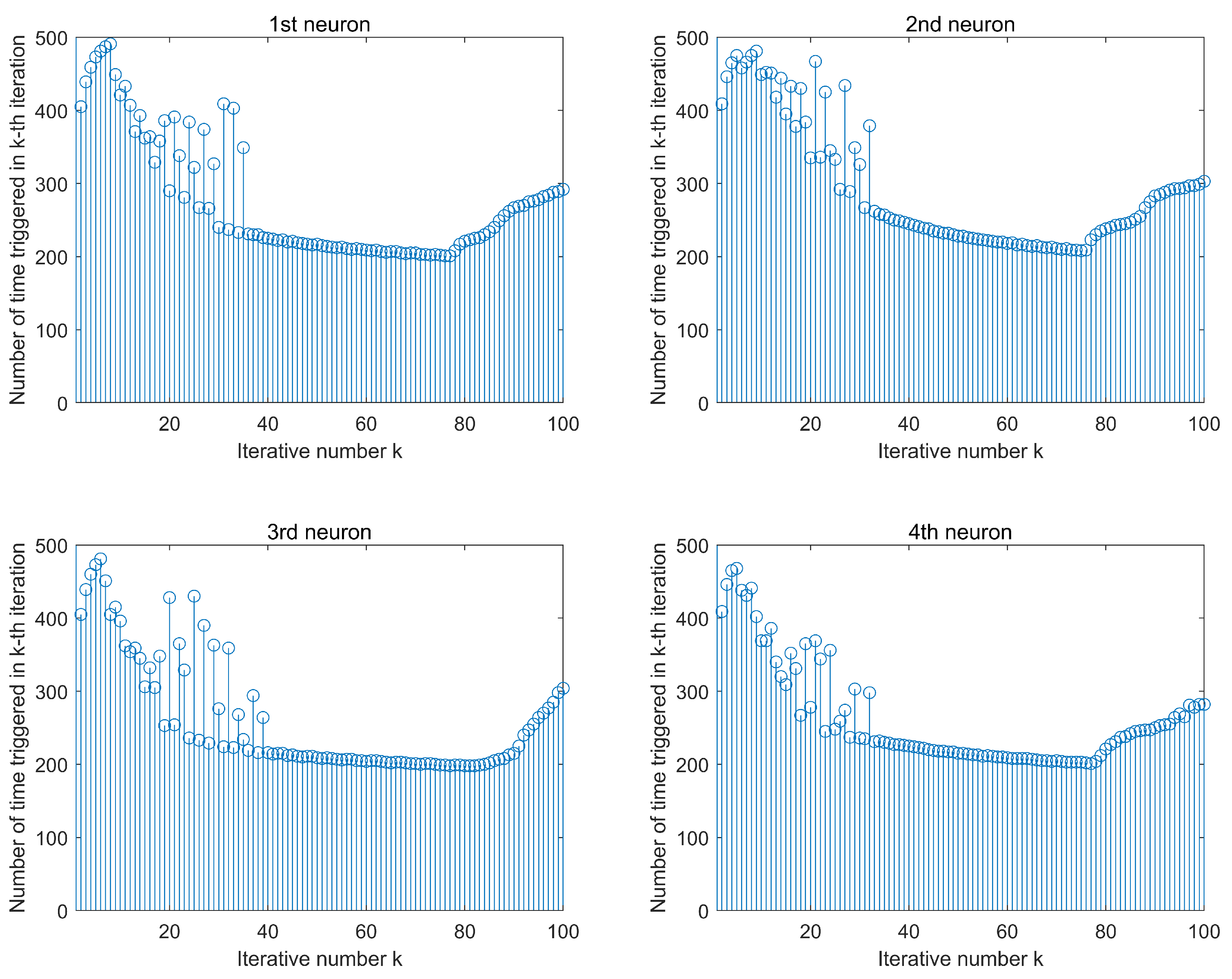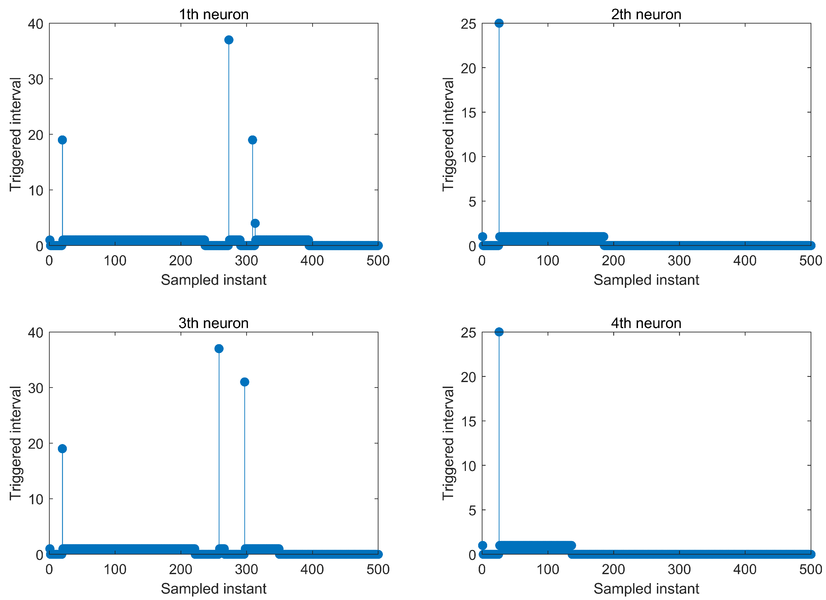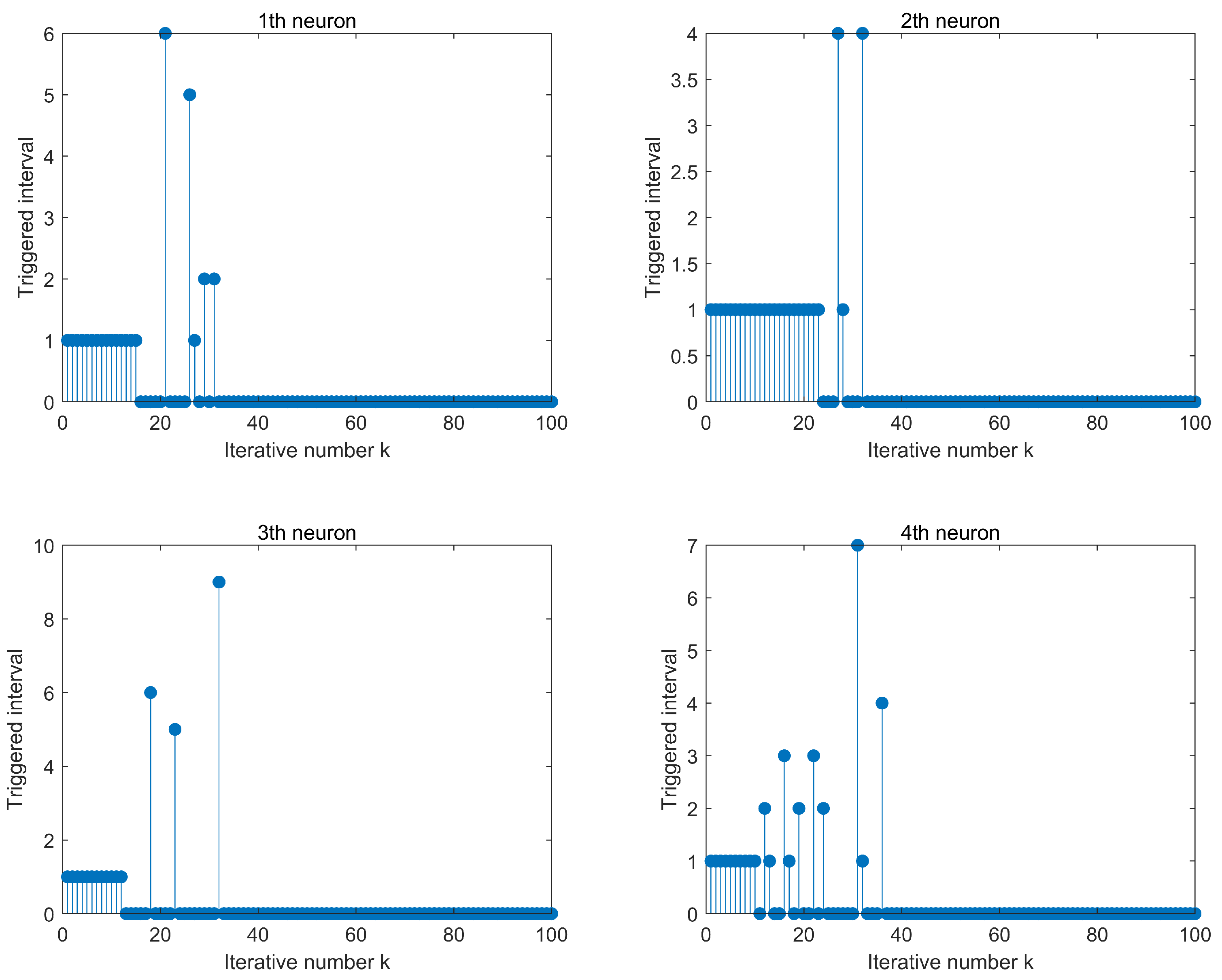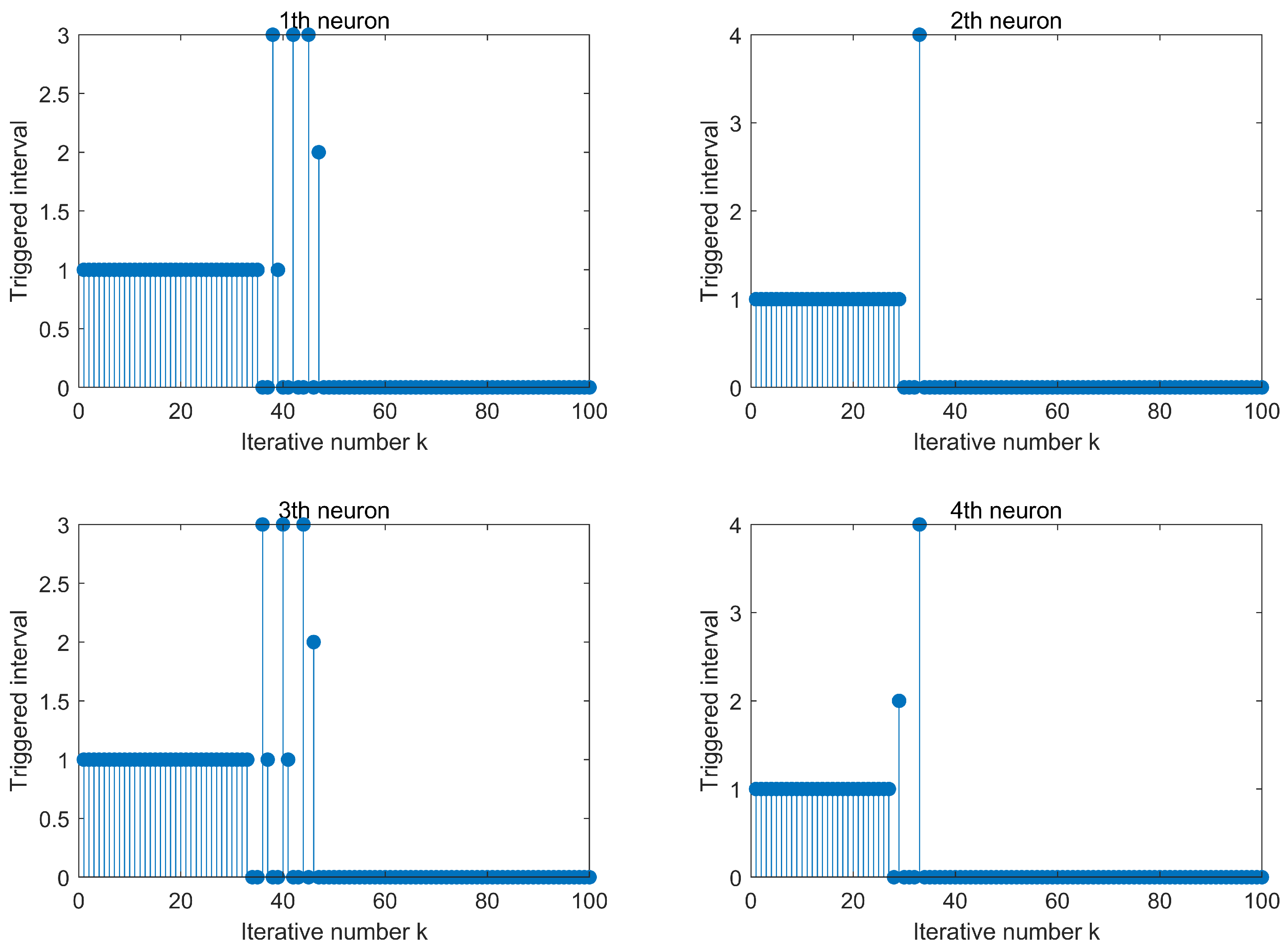 - Unlike the reference [16], conventional ILC for RDNN which updates controllers at all sampling points, our ETILC adds a sampling-based event-triggering condition only updating when error energy fails to decay, reducing controller updates while ensuring synchronization. ETILC precisely controls the update frequency of ILC inputs through triggering conditions, eliminating the need for additional redundant update operations. In essence, it shares the same design goal as ETC in that both achieve efficient saving of system resources and reduction in energy consumption by decreasing the amount of data transmission and the number of controller updates during the iteration process.